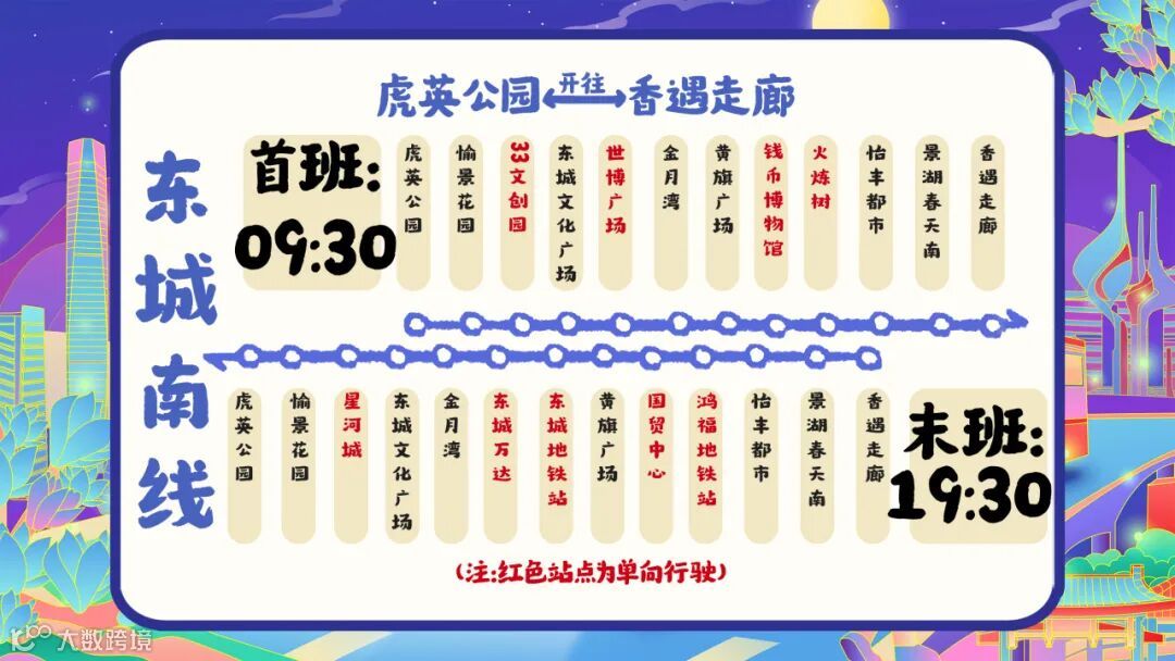 东城南线线路起讫点为“虎英公园—香遇走廊”,单程约12公里。途经愉景花园、33文创园、黄旗广场、钱币博物馆等站点。