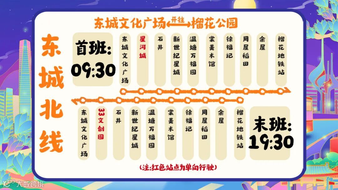 东城北线线路起讫点为“东城文化广场—榴花地铁站”,单程约16公里,途经星河城、石井、棠美术馆、徐福记、周屋稻田、余屋等站点。