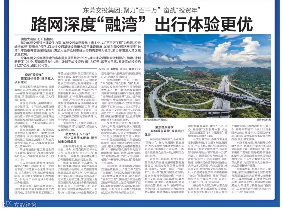作为东莞交通强市建设生力军,东莞交投集团聚焦主责主业,以“百千万工程”为统领,积极响应东莞“投资年”号召,以加快交通基础设施重大项目建设进度、加速东莞交通路网深度“融湾”,不断提升交通服务品质、满足人民群众对美好出行的需求等为抓手,助力粤港澳大湾区高质量发展。