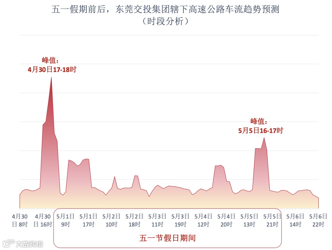 预测出行车流高峰时段集中在4月30日的16时至20时;预测返程车流高峰时段集中在5月5日的15时至18时。
