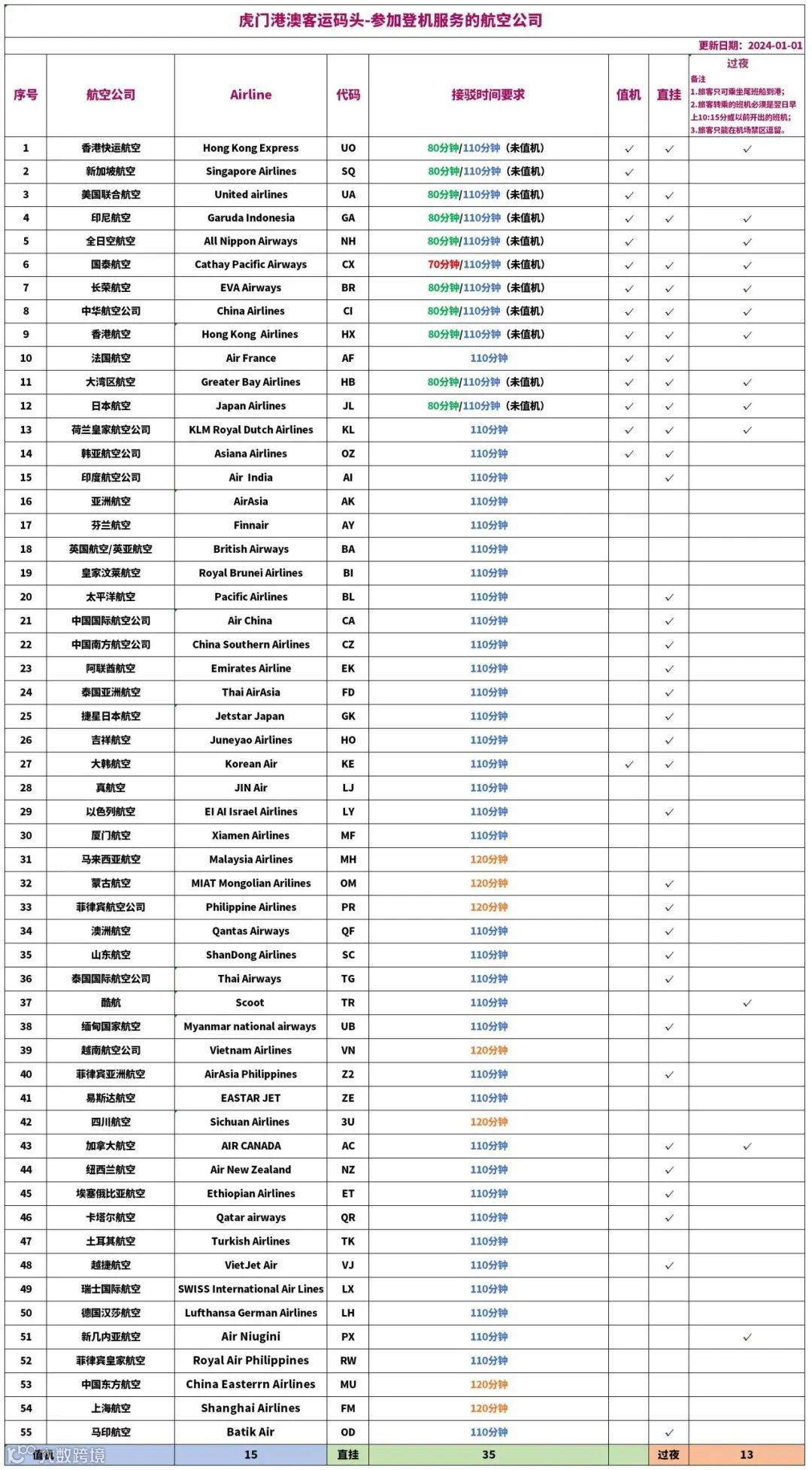 非值机 航空公司的接驳时间缩短至110分钟(原150分钟)
