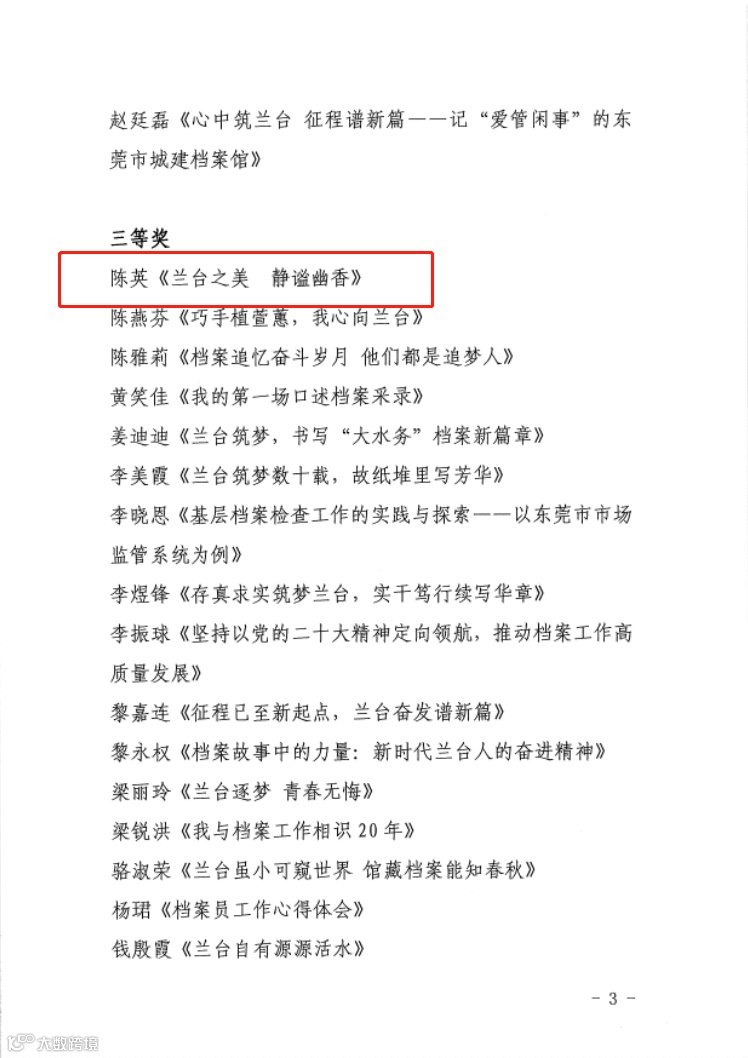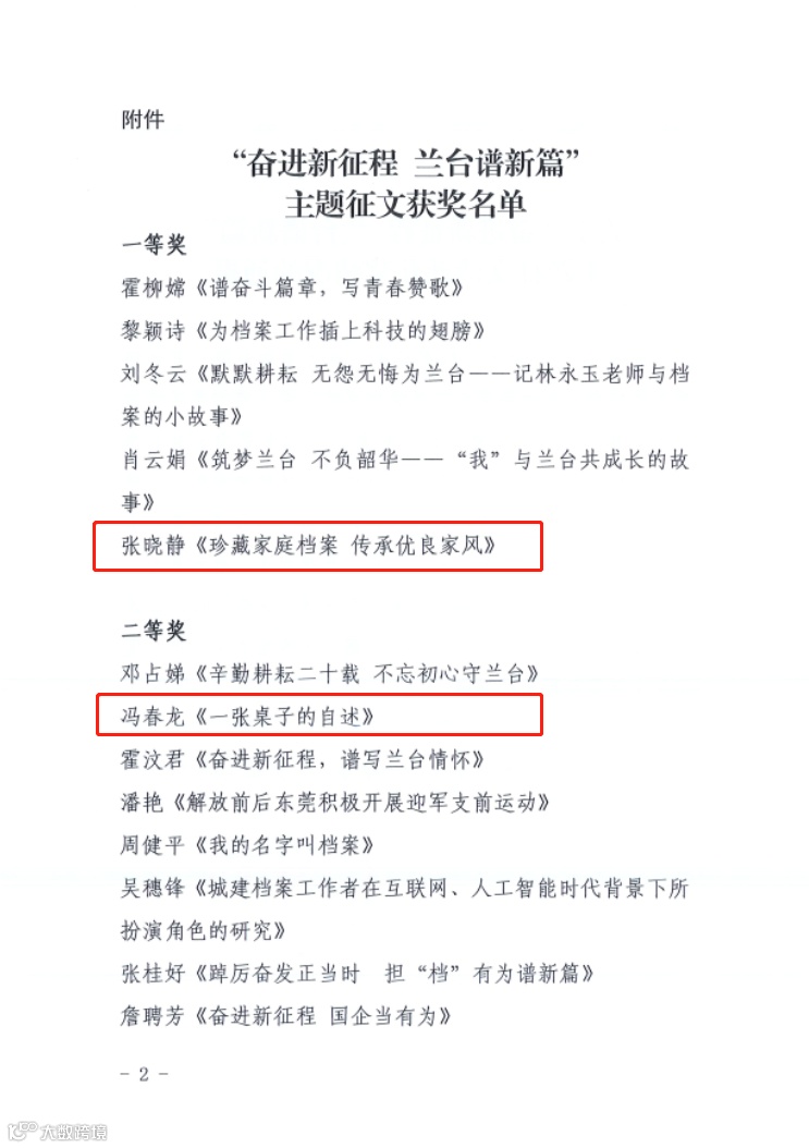 近日,市档案局通报了“奋进新征程 兰台谱新篇”主题征文活动的评奖结果,东莞交投集团办公室张晓静撰写的《珍藏家庭档案 传承优良家风》获得一等奖,集团办公室冯春龙撰写的《一张桌子的自述》获得二等奖,轨道一号线公司陈英撰写的《兰台之美 静谧幽香》获得三等奖。