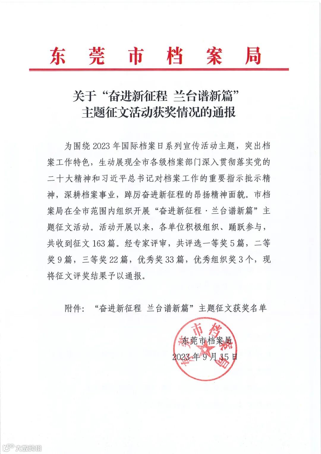 今年5月,市档案局在全市范围内组织开展“奋进新征程 兰台谱新篇”国际档案日主题征文活动,经专家评审,从全市163篇征文中评选出一等奖5篇,二等奖9篇,三等奖22篇,优秀奖33篇,优秀组织奖3个。集团各企业积极参加、踊跃投稿,共报送作品8篇,从档案工作的视角展示了东莞交投集团的辉煌发展历程和干部职工传承优良作风、踔厉奋进新征程的昂扬精神面貌,最终共有3篇作品获奖。