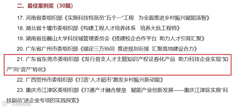 东莞控股公司下属企业融通租赁公司发行的全国首支“人才”主题知识产权证券化产品获评2023年全国人才工作创新案例“最佳案例奖”