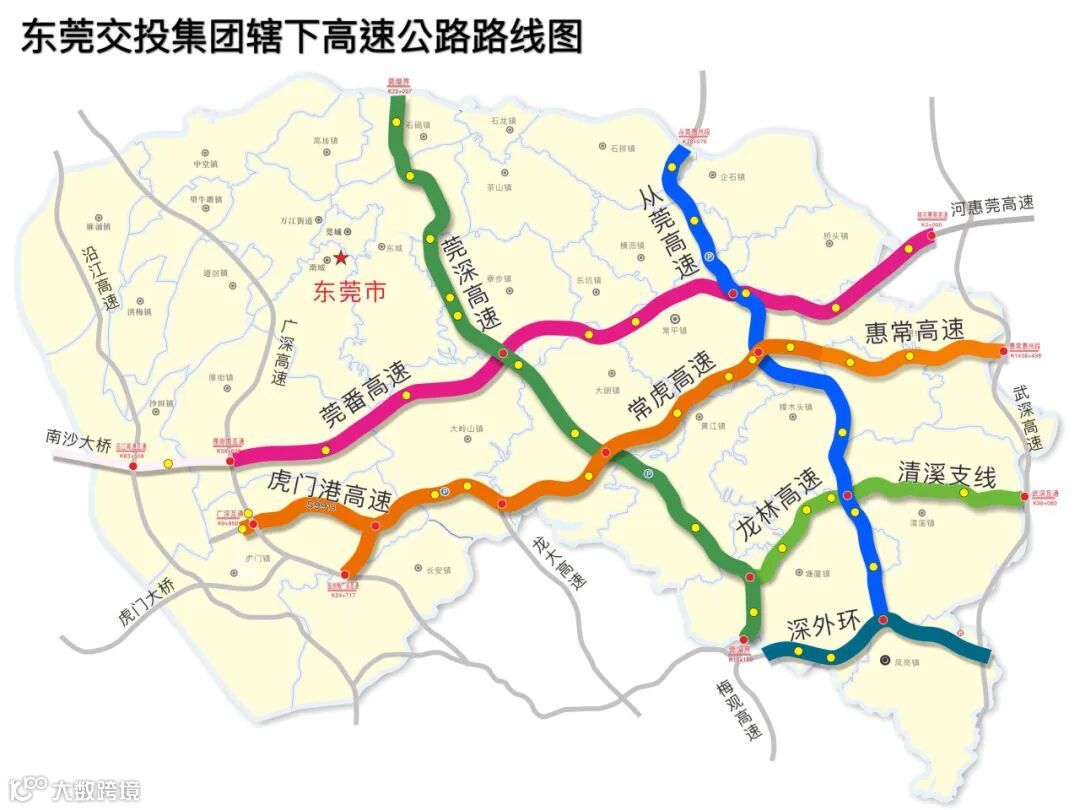 东莞交投集团所辖高速公路包括:莞深高速(珠三角环线高速东莞段G94),龙林高速(惠塘高速东莞段S22),常虎高速(莞佛高速东莞段G9411),惠常高速(甬莞高速东莞段G1523),从莞高速(从莞深高速东莞段S29),深外环高速(深外环高速东莞段S86),莞番高速(广龙高速东莞段S6)。