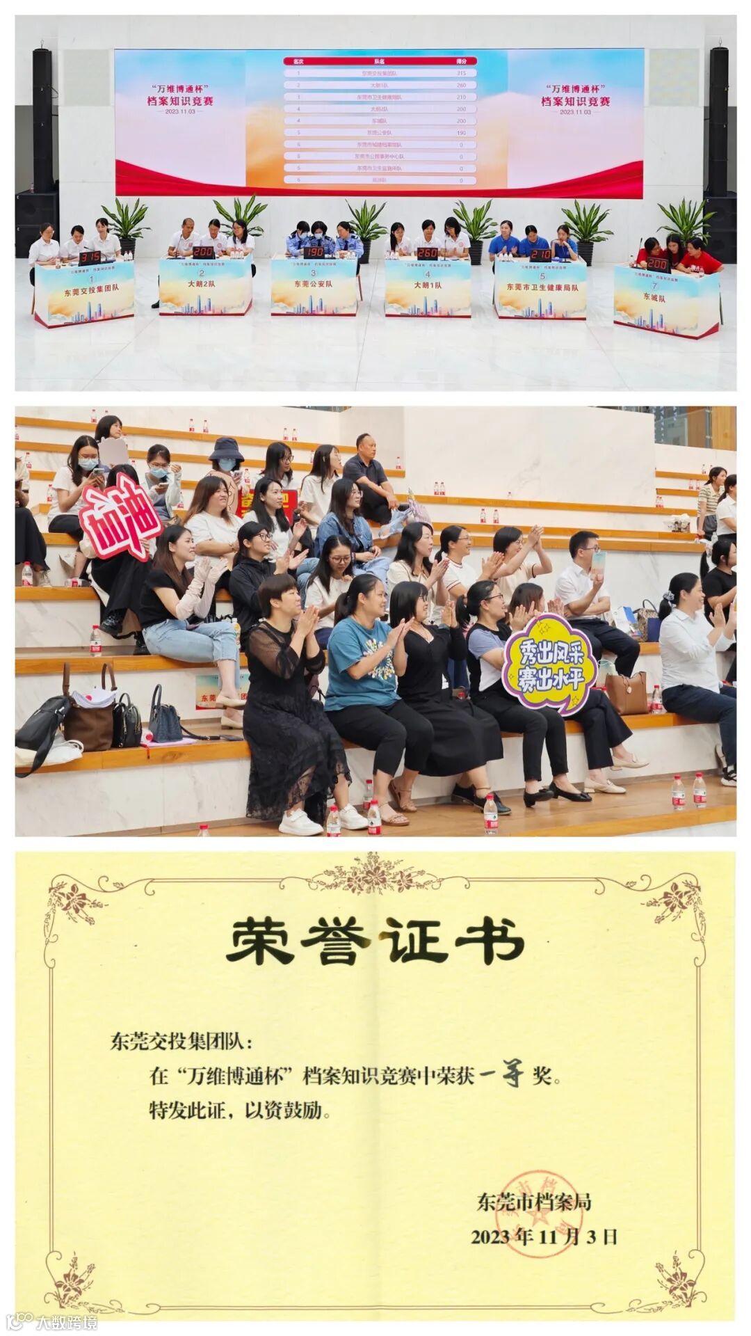 11月3日,由市档案局举办的“万维博通杯”档案知识竞赛决赛在东莞市民服务中心市民大讲堂举行。东莞交投集团工联会主席袁翠娟及集团各下属企业档案工作人员前往现场观赛。东莞交投集团队在10支参赛队伍中脱颖而出,最终获得一等奖。