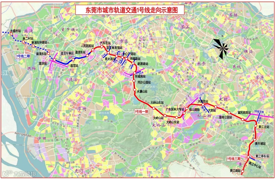 由东莞交投集团下属轨道一号线公司作为项目建设单位的轨道1号线贯穿东莞市水乡片区、中心城区、中部片区、松山湖高新产业区、东南临深片区,起于望洪站、止于黄江中心站,途经望牛墩、洪梅、道滘、万江、南城、东城、大岭山、松山湖、大朗、黄江等10个镇街(园区),线路总长57.46km,其中高架线7.71km,地下线49.43km,设车辆段和停车场各一座、主变电所4座,共设车站25座,其中13座为换乘站,将实现与穗莞深、莞惠、佛莞城际铁路、已开通运营的2号线及规划的1号线支线、3、6、7、8、12号线换乘。