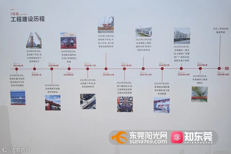 东莞市轨道一号线公司组织开展了多轮技术方案论证比选,组织中国中铁、中国铁建、广东省建工等施工承包商经过周密部署,克服了重重困难。自2020年8月28日全线首台盾构机始发以来,全线累计投入盾构机50台次,顺利穿江过河12次,穿越建(构)筑物136次,穿越极厚淤泥层、富水砂层、孤石群、上软下硬、全断面硬岩26.34km,主动排除安全风险隐患2626处,安全质量管理平稳可控。