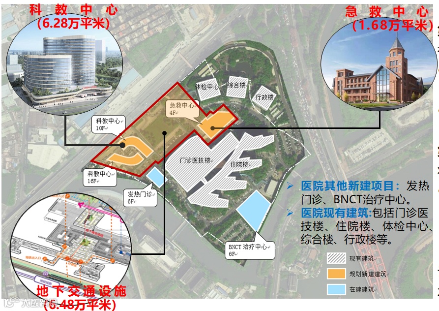 提升医疗配套设施,打造高水平医院建设。本项目一方面对现有医疗科目进行提升补充,将新建科教中心(科研、教学、学术交流、医疗配套)和急救中心(新增急救用房约1.68万平米,兼顾平疫、平战需求);另一方面将对就医交通环境予以升级改造,新建地铁站出入口、地面公交首末站和停靠站、出租车上下客站以及两层地下P+R停车场,通过多种交通方式互联互通,实现交通设施与医疗设施无缝衔接,为推进高水平医院建设提供有力保障。