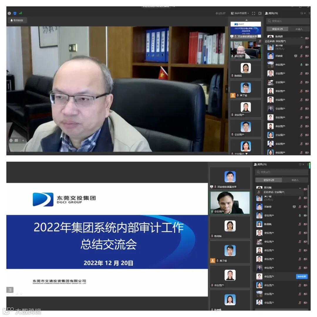 12月20日,东莞交投集团风险管理部以视频会议形式召开2022年集团系统内部审计工作总结交流会,东莞交投集团党委委员、副总经理袁国超,市轨道公司党委委员、副总经理胡文伟,集团风险管理部部长刘德胜及相关人员、直属各企业分管内审工作的领导及内审部门负责人参加了会议。