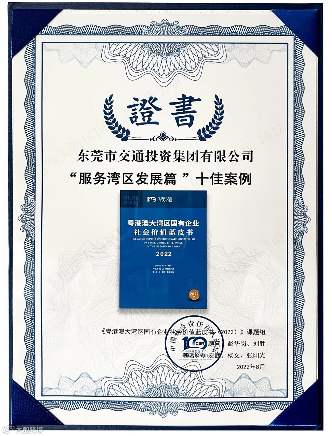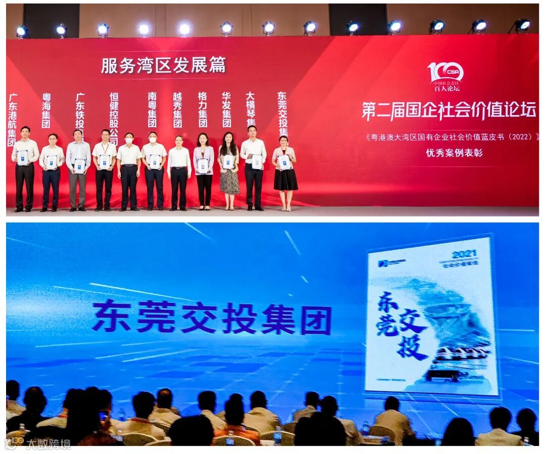 《粤港澳大湾区国有企业社会价值蓝皮书(2022)》在论坛正式发布,东莞交投集团报送的《交通大发展,融湾再提速——以重大项目推动大湾区一体化发展》成功入选蓝皮书“服务湾区发展篇”十佳案例,受到表彰。