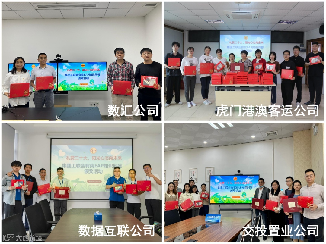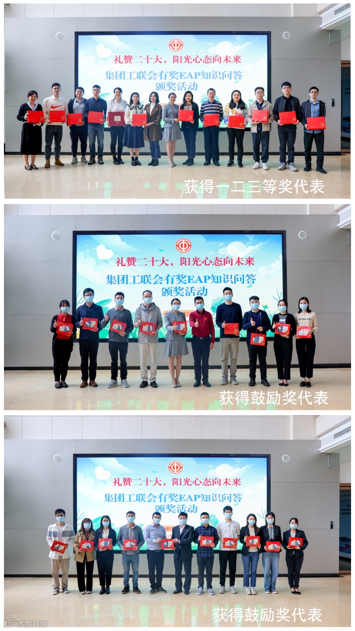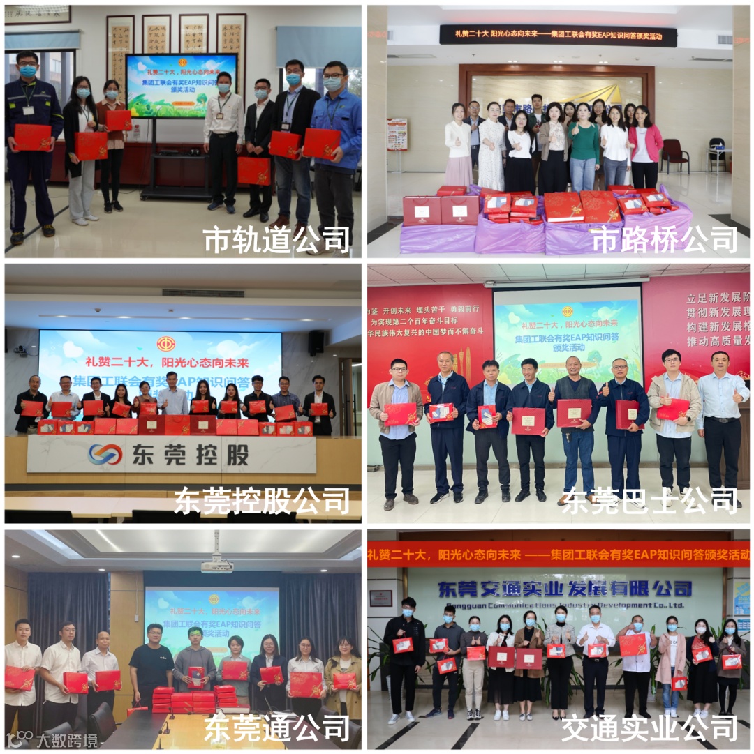 11月8日,东莞交投集团工联会在集团一楼大堂“举行礼赞二十大,阳光心态向未来”——有奖EAP知识问答颁奖活动,集团工联会主席袁翠娟为获奖职工代表颁奖,集团工联会班子成员等参加活动。鉴于本次活动获奖人数较多,集团工联会委托各基层工会在各单位举行颁奖活动向获奖职工颁奖。