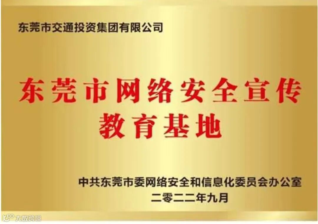 2022年9月,东莞市委网信办授牌东莞交投集团为“东莞市网络安全宣传教育基地”。