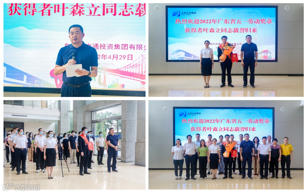4月29日,东莞交投集团在本部一楼大堂举行仪式,欢迎叶森立载誉归来,东莞交投集团党委书记、董事长,市轨道公司党委书记罗沛强;东莞交投集团工联会主席袁翠娟以及集团各级工会、集团本部员工代表约30人参加了欢迎仪式。