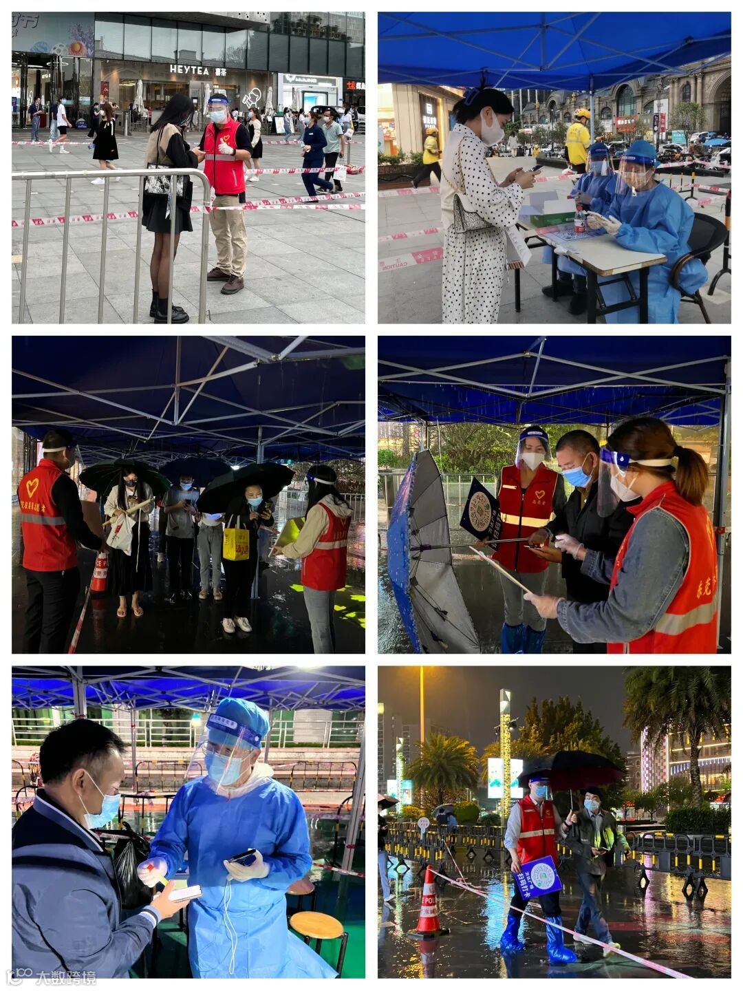 晚上7时,一场暴雨突然袭来,遮雨帐篷被吹塌、隔离护栏被吹倒,但是核酸检测工作始终未中断,暴雨中志愿者依然坚守岗位,耐心细心地进行讲解、引导工作,来回撑伞帮助市民躲雨,努力确保完成当天的核酸检测任务。夜晚10时,核酸检测支援服务终于结束了,志愿者纵然疲惫,但依然坚持帮忙收拾现场物资,站好服务工作的最后一岗。