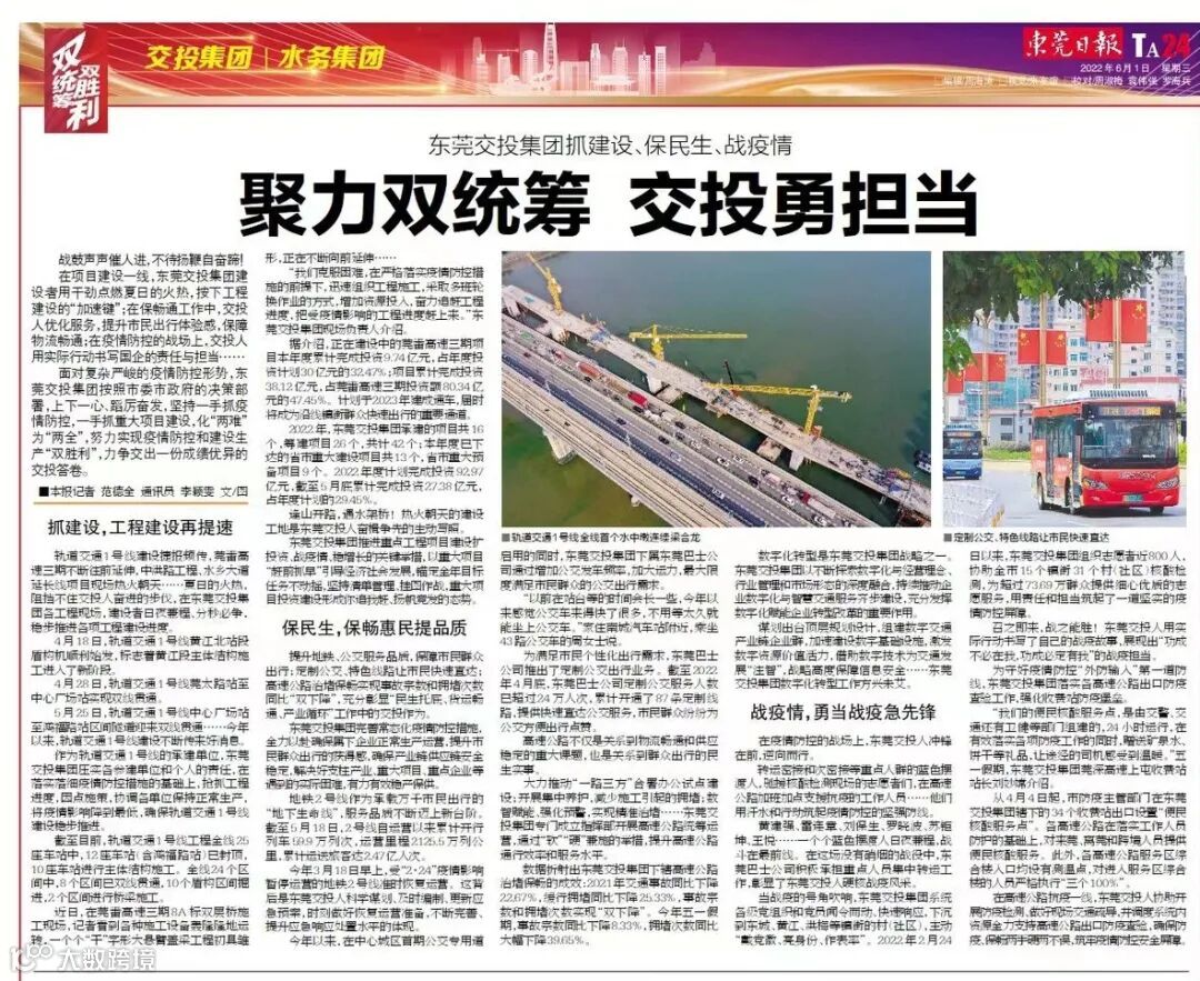 在项目建设一线,东莞交投集团建设者用干劲点燃夏日的火热,按下工程建设的“加速键”;在保畅通工作中,交投人优化服务,提升市民出行体验感,保障物流畅通;在疫情防控的战场上,交投人用实际行动书写国企的责任与担当……
