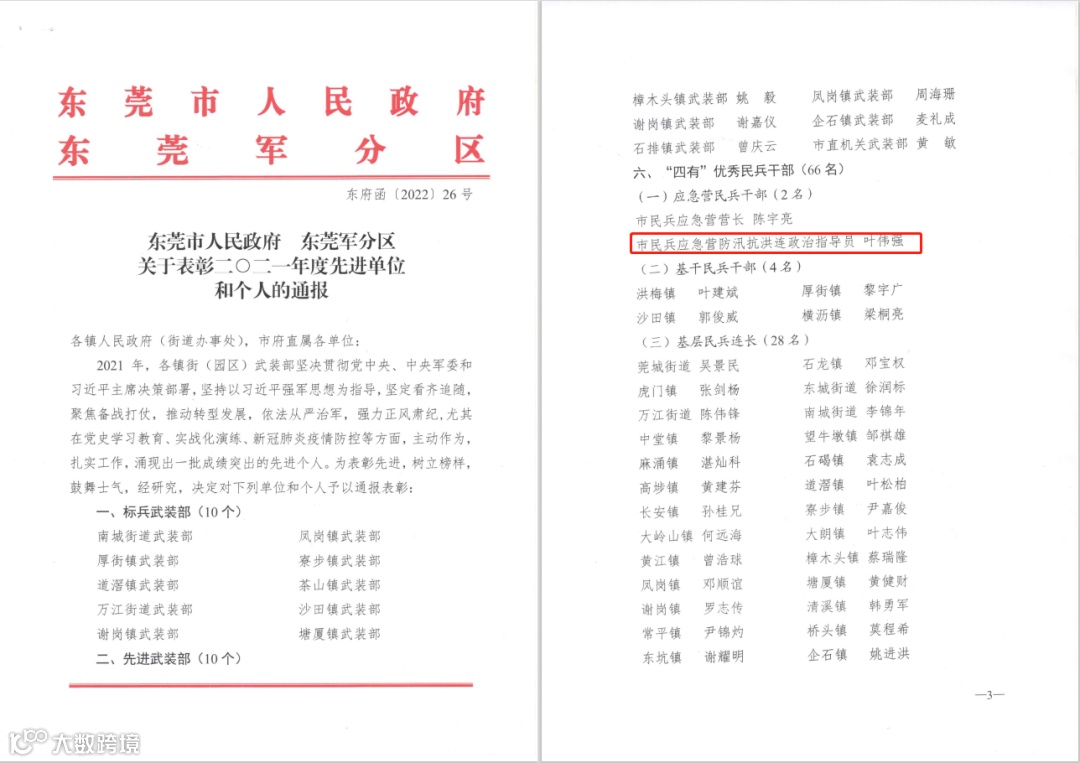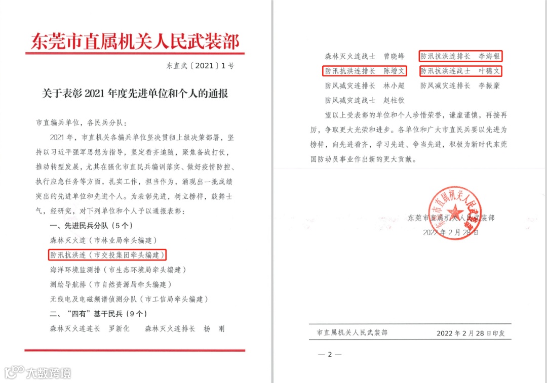 近日,东莞市人民政府、东莞军分区发布《关于表彰二〇二一年度先进单位和个人的通报》、东莞市直机关武装部发布《关于表彰2021年度先进单位和个人的通报》,东莞交投集团牵头编建的市民兵防汛抗洪连荣获2021年度东莞市“先进民兵分队”称号,叶伟强(市民兵防汛抗洪连政治指导员)荣获“四有”优秀民兵干部称号,李海银(市民兵防汛抗洪连排长)、陈增文(市民兵防汛抗洪连排长)、叶穗文(市民兵防汛抗洪连副连长)荣获“四有”基干民兵称号。