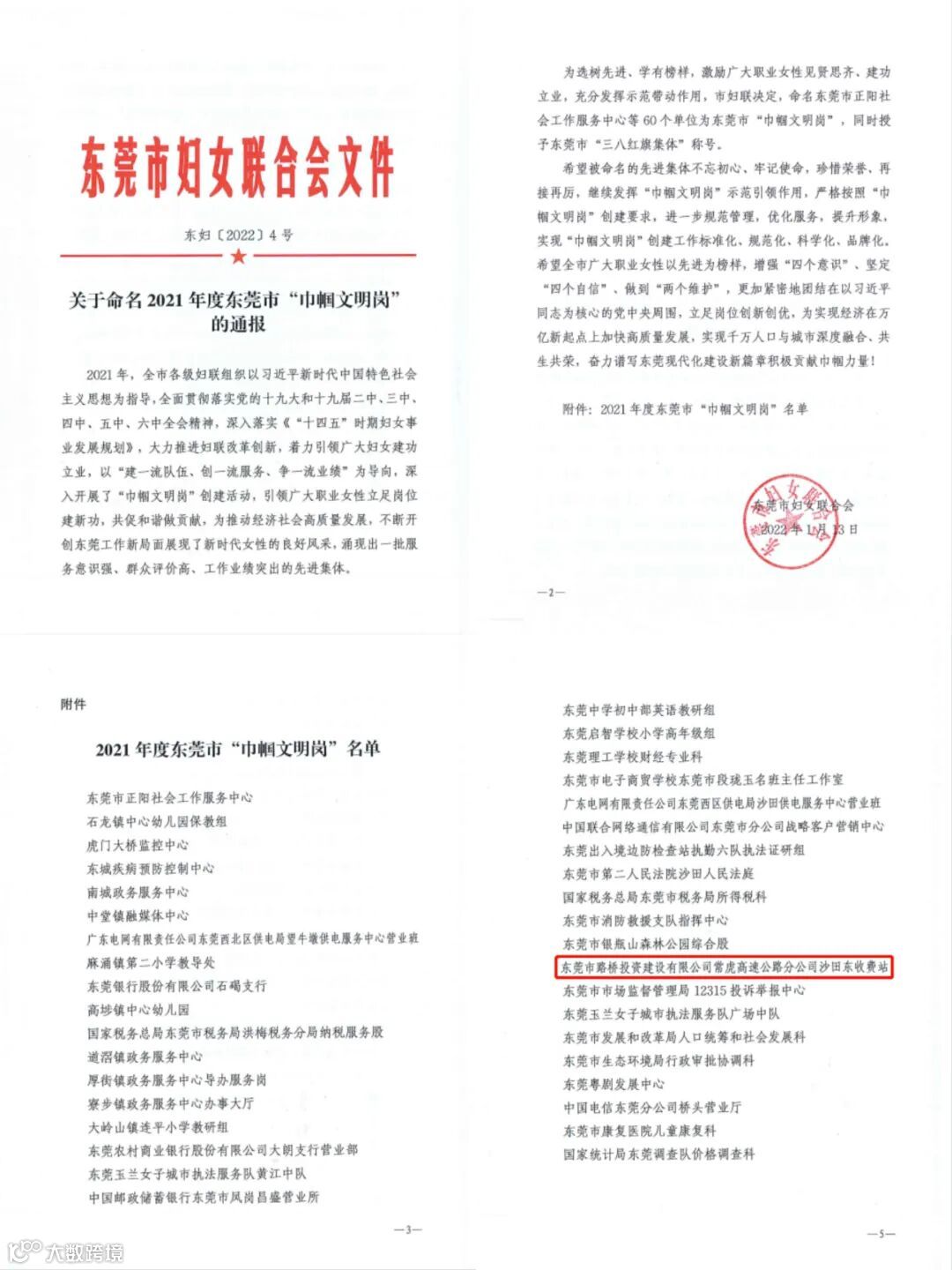 近日,东莞市妇女联合会发布《关于命名2021年度东莞市“巾帼文明岗”的通报》,东莞市路桥投资建设有限公司常虎高速公路分公司沙田东收费站荣获2021年度东莞市“巾帼文明岗”称号。