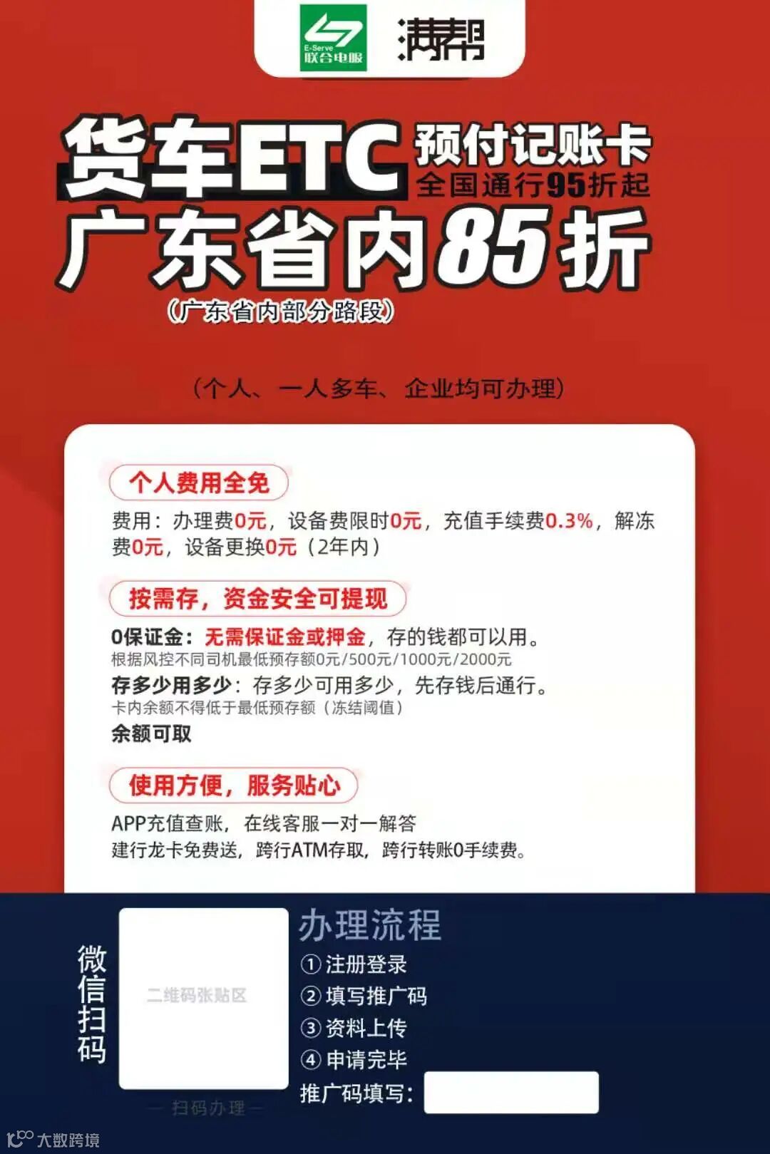 免保证金、0元办理货车ETC,通行广东省内74条高速公路可享受8.5折通行费优惠。