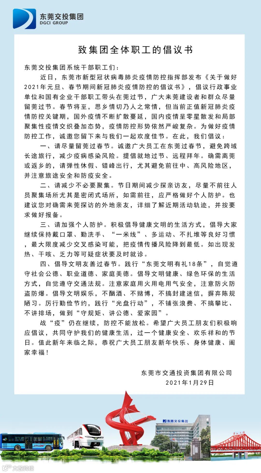 当前正值新冠肺炎疫情防控关键期,国外疫情不断扩散蔓延,国内疫情呈零星散发和局部聚集性疫情交织叠加态势,疫情防控形势依然严峻复杂。为做好疫情防控工作,东莞交投集团诚邀您留下来与我们一起欢度佳节。在此,发出致集团全体职工的倡议书: