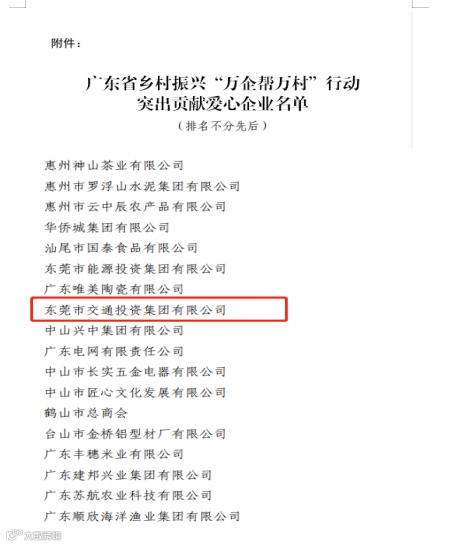 日前,中共广东省委农村工作办公室、广东省人民政府国有资产监督管理委员会、广东省工商业联合会联合发文《关于表扬在乡村振兴“万企帮万村”行动中作出突出贡献爱心企业的通报》(粤委农办函〔2020〕34 号),决定对广东省乡村振兴“万企帮万村”行动中作出突出贡献的100家爱心企业予以通报表扬,东莞市交通投资集团有限公司荣登表扬名单。
