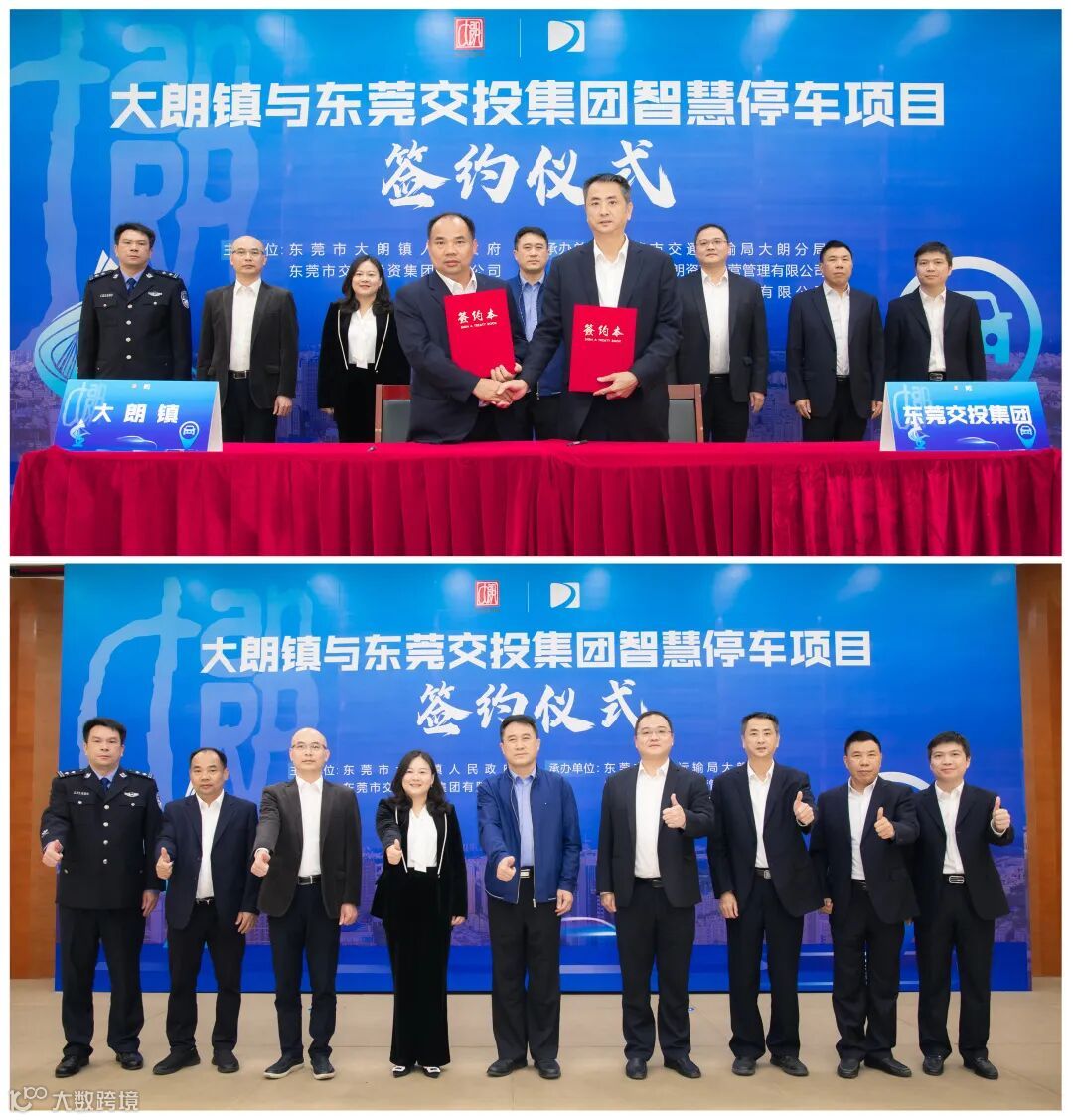 大朗镇代表大朗资产经营公司总经理陈柱权与东莞交投集团代表静态交通公司总经理方灿松签署合作协议,大朗镇成为我市第13个将镇内停车资源纳入东莞交投集团统筹整合的镇街。