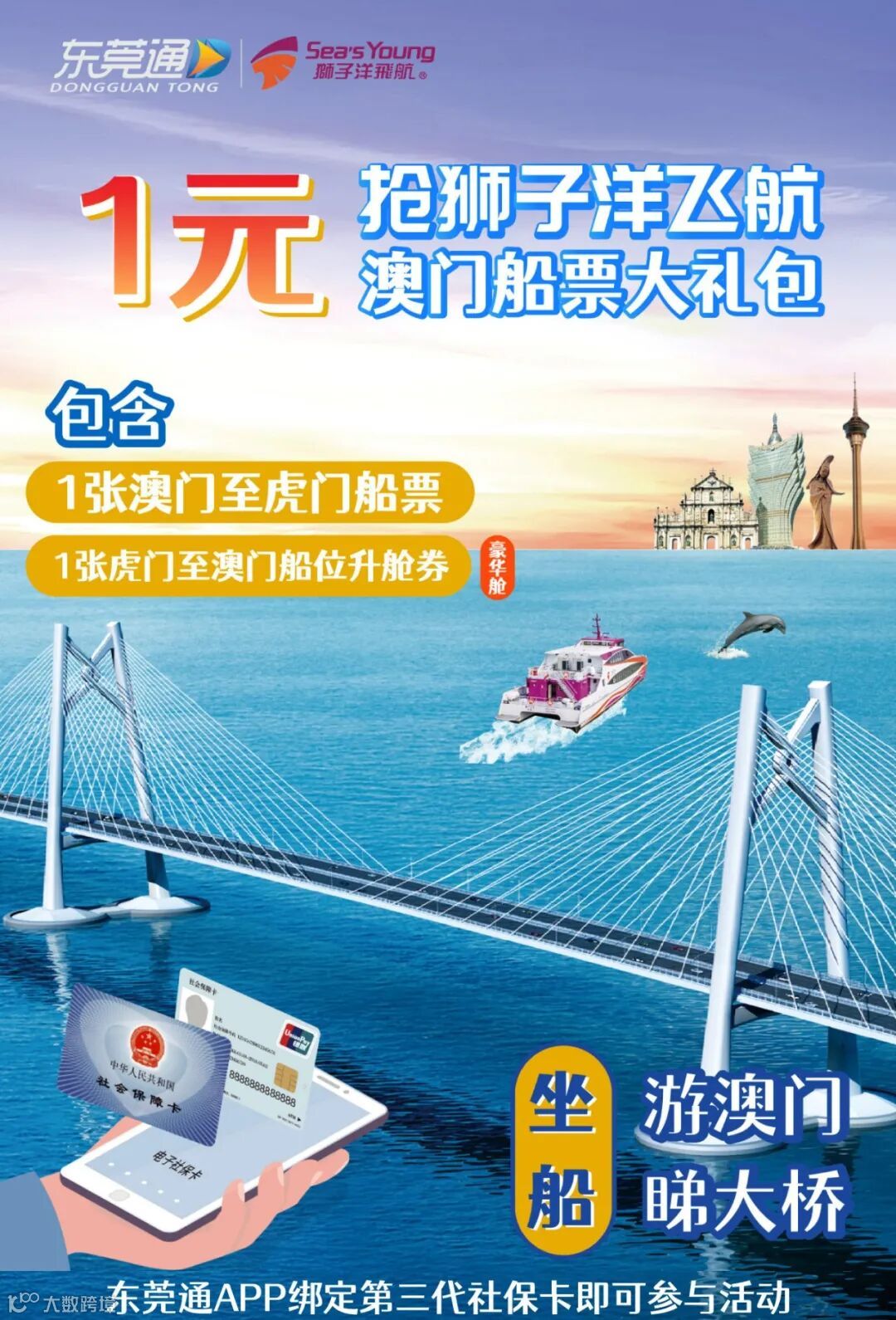 即日起,凡是使用东莞通APP绑定第三代社保卡的新老用户,可1元抢购狮子洋飞航澳门船票大礼包一份!