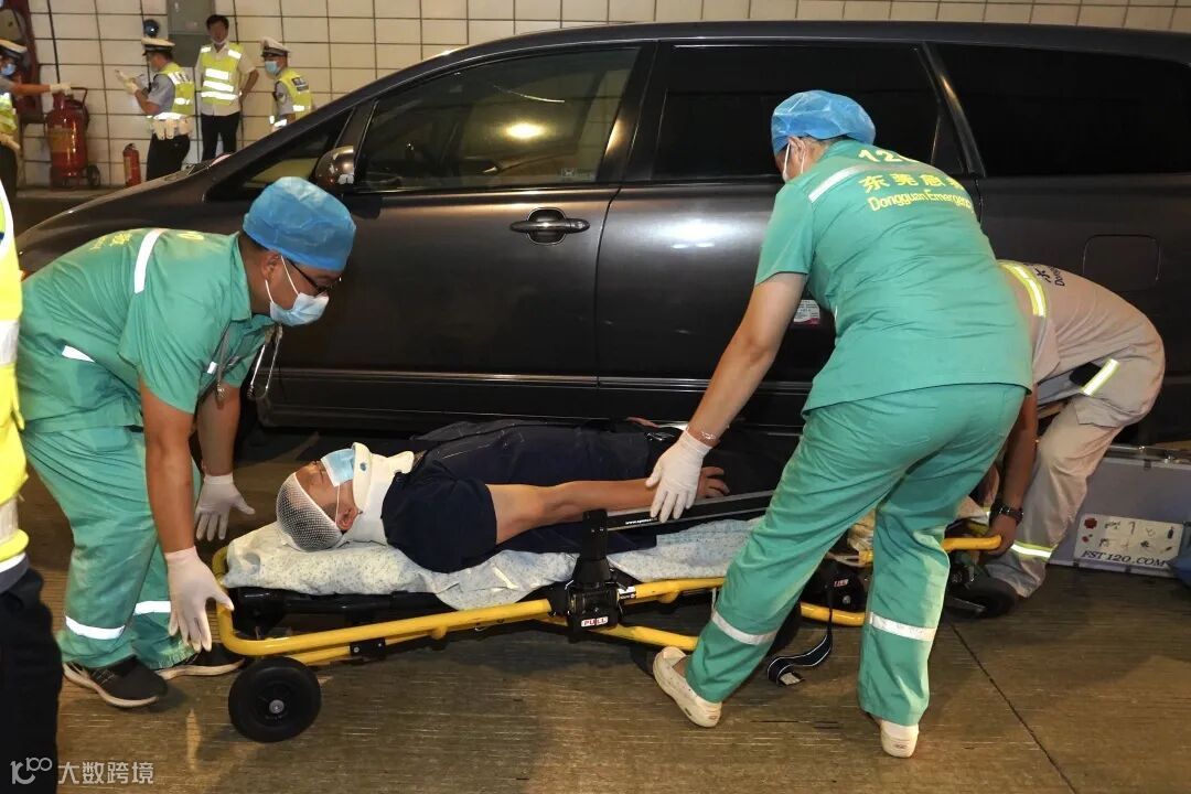 本次演练模拟从莞高速公路北行观音山隧道内K104+410处,发生一起货车爆胎,一辆小轿车避让不及与货车追尾相撞,导致引燃货车内货物发生火灾、小轿车内司机头部受伤、隧道内堵塞滞留较多车辆的事故。