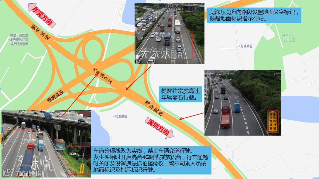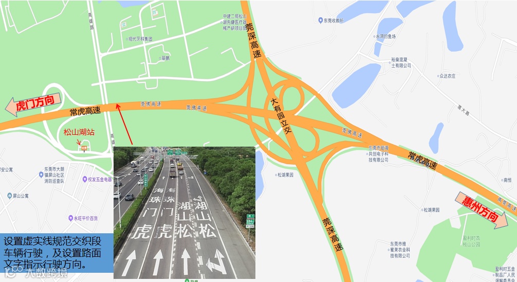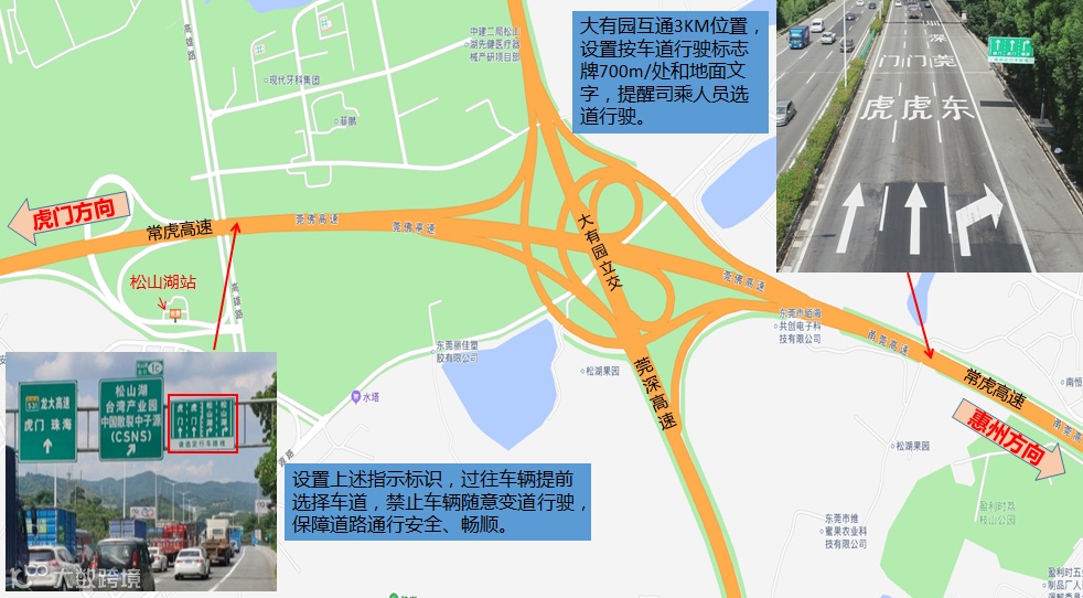 (三)在往松山湖互通虎门方向设置了“虎门方向请走左侧车道”、“前往松山湖请靠右行驶”标牌、“虚实线”以及“往虎门、珠海、松山湖地面”文字标识。往虎门方向的车辆请尽量不要占用右侧车道,该车道供从莞深高速、松山湖收费站进入高速的车辆行驶,以平衡各车道车流量,减少车辆频繁变道引发的事故和拥堵。