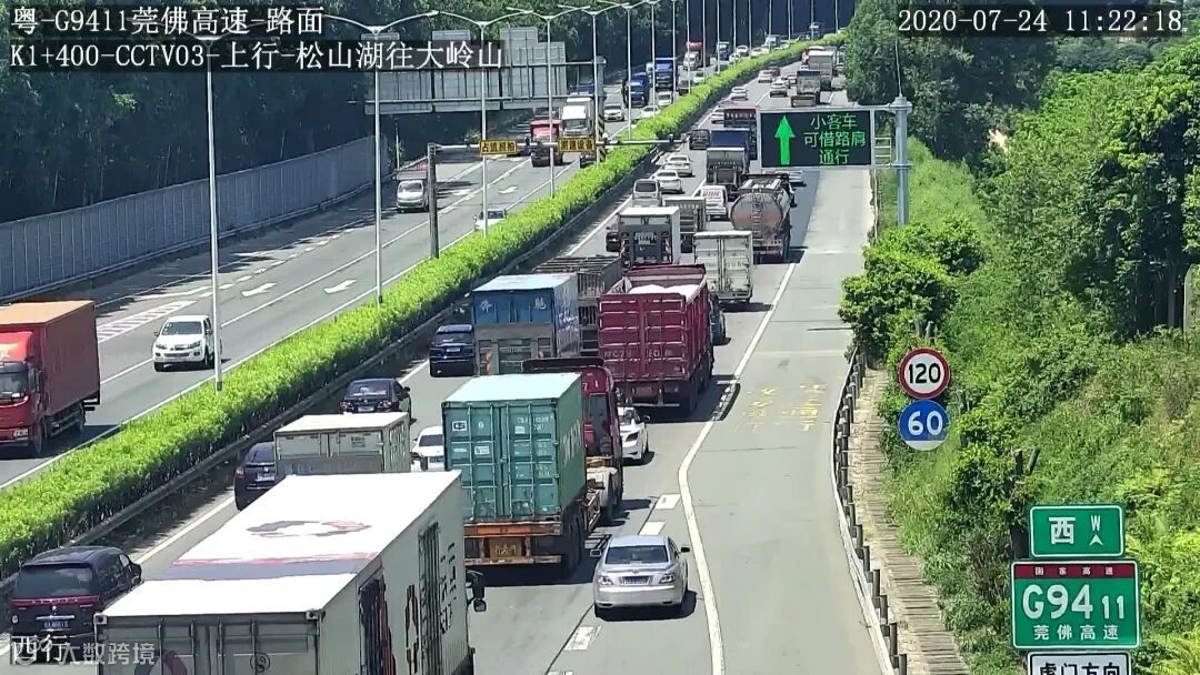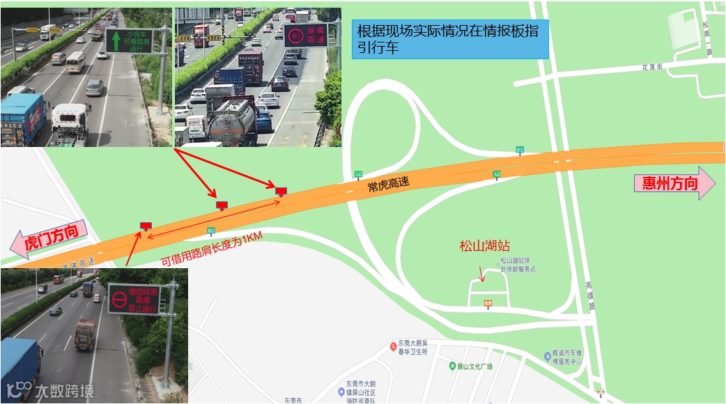 东莞交投集团高速公路统筹运营指挥部与市交通运输局、市交警支队、东莞高速公路交警大队等单位共同深入分析,大胆创新,决定采取在高峰时段允许小客车借用路肩行驶(限速80km/h)的措施(非小客车不能借用路肩),提升常虎高速西行松山湖互通至龙大互通路段的通行能力。