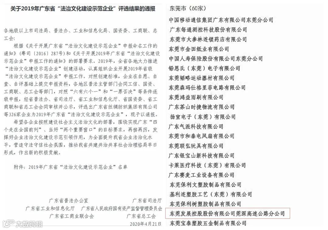 经过层层审核和筛选,东莞交投集团下属东莞控股莞深高速分公司以扎实的企业法治文化创建成果,被评为广东省“法治文化建设示范企业”。