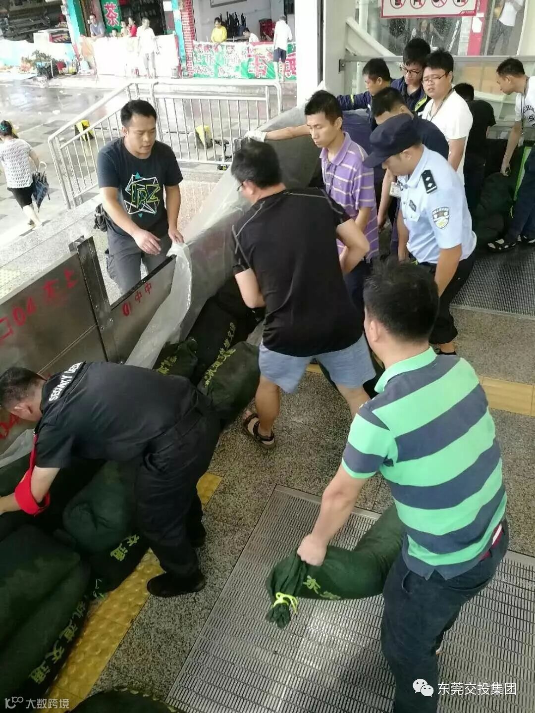 台风突然来袭,大量旅客滞留或有市民进站躲避风雨,工作人员暖心送来热水及补给品,妥善安排,传递东莞温暖。