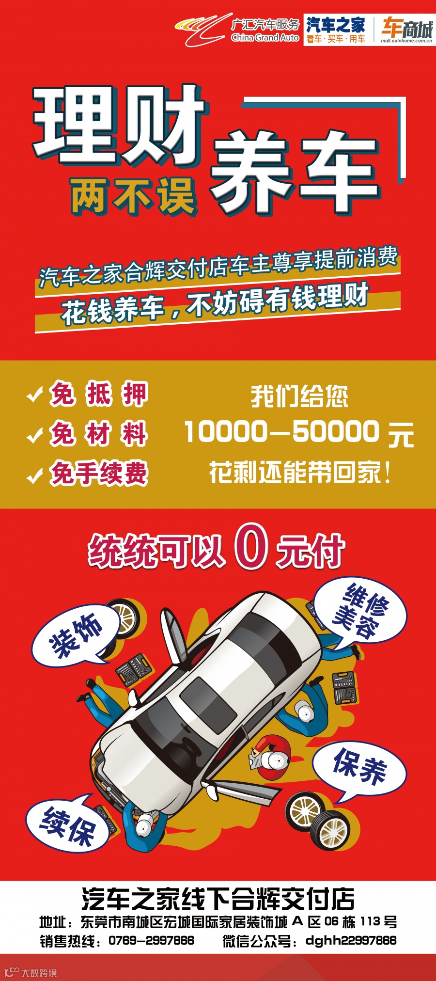维修美容、装饰装潢、续保、保养0元付,提供两证得1-5万资金消费,客户自由支配
