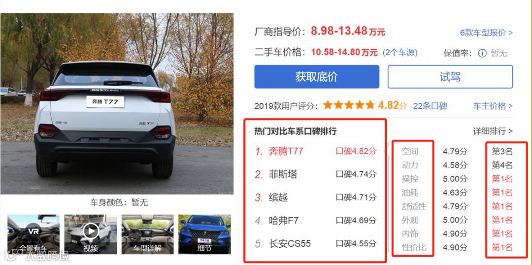 由数据可知,奔腾T77与其他热销车型口碑对比,人们对它的评价还是蛮高的。