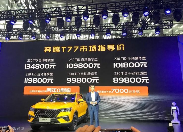 奔腾T77是一汽奔腾全新换标的第一款车型,全新的品牌LOGO被称为“世界之窗”。新车共推出6款车型,官方指导价在8.98-13.48万元,230TID直列四缸涡轮增压直喷发动机匹配的是6速手动或7速双离合变速箱。