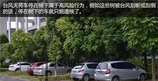 选择停车位时先观察一下周围情况,比如是不是贴近露天广告牌,楼上有没有花盆、杂物或者锈迹斑斑的空调外机。要是把车子停在地下车库,一定要事先看看车库的排水系统是不是完善,免得台风过后,要从水里去捞车子。