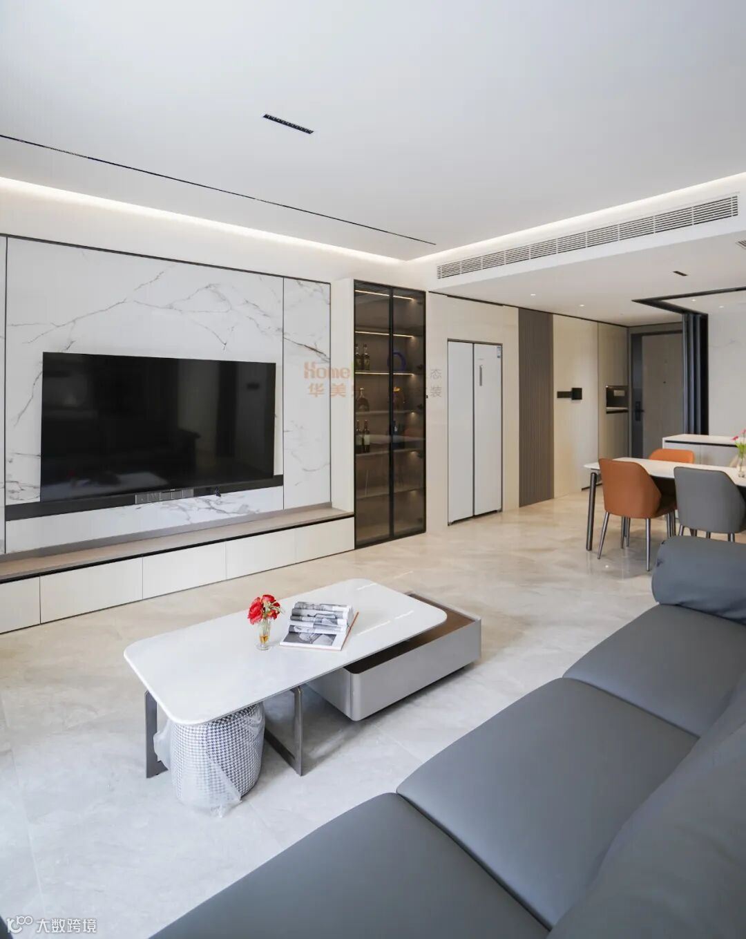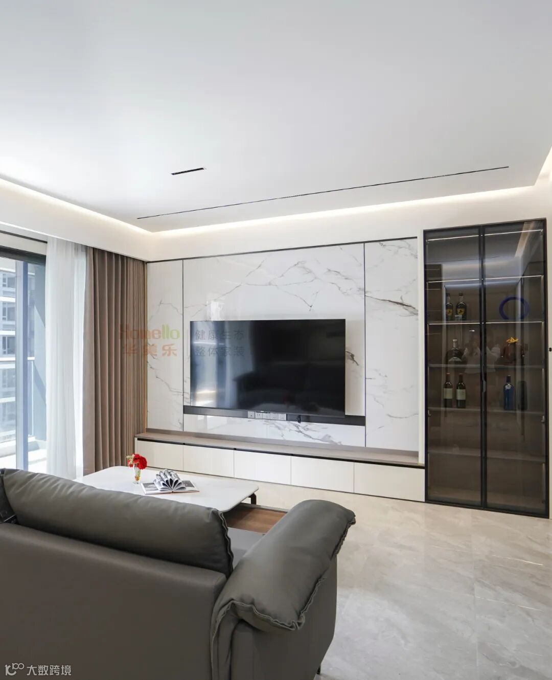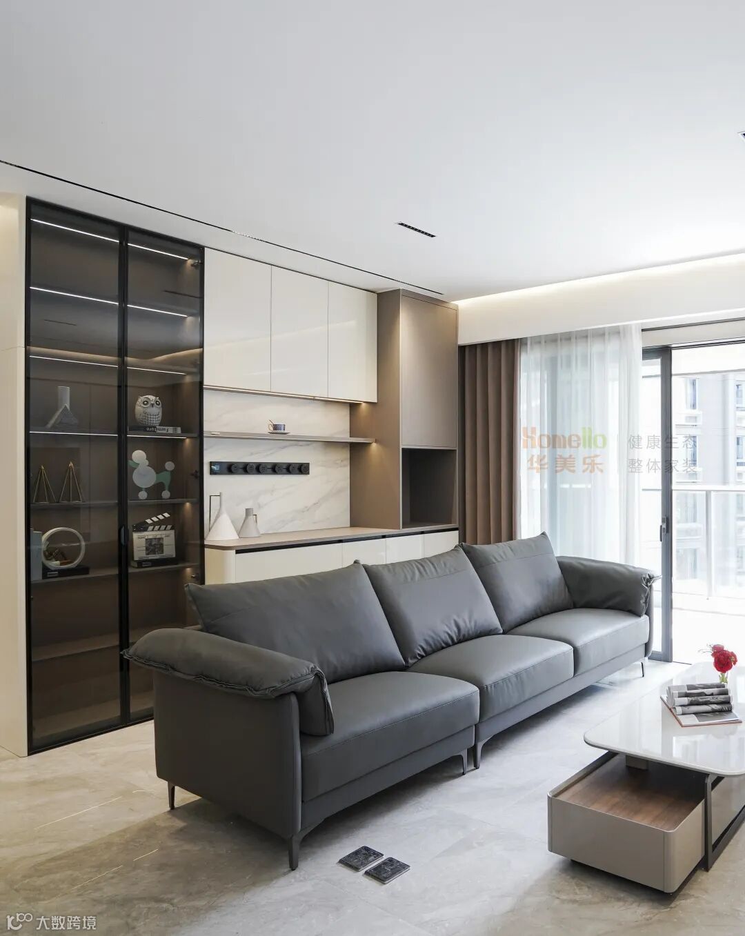 客厅里,“灰色沙发”常被当作“百搭基底”,但要让它不显得单调,还得靠「落地电视柜+边柜展示柜+岩板」的黄金组合来点睛,把“简约”与“高级”焊死 。窄边展示柜,既补全了收纳,又成了客厅的 “隐形装饰墙”,让空间利用率瞬间拉满。