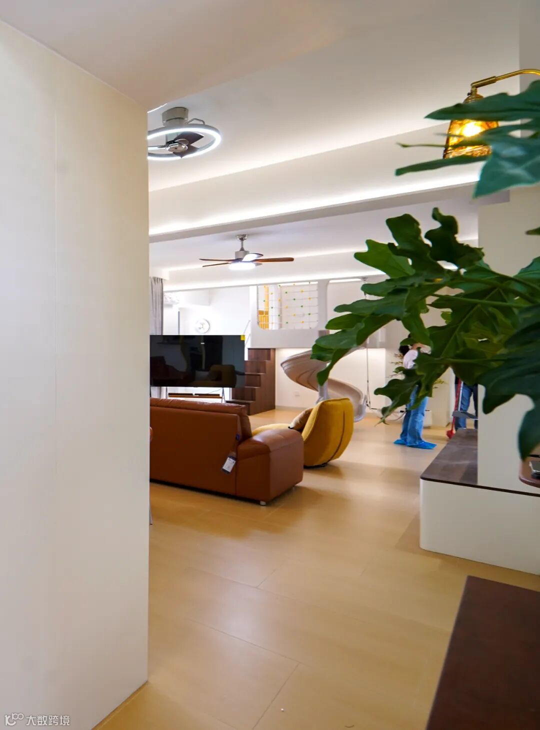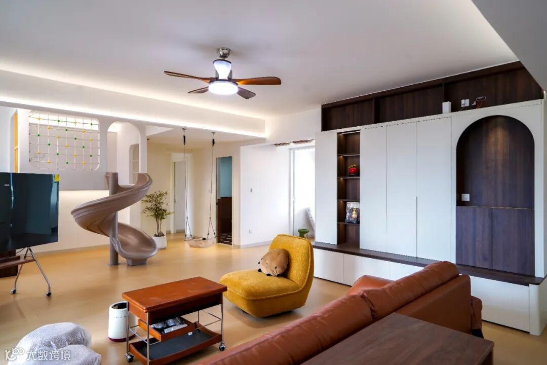 既有复古质感的暖调软装,又藏着让娃疯玩的童趣设计。谁能想到,客厅里装滑梯、搭秋千,居然能和 “高级感” 共存?