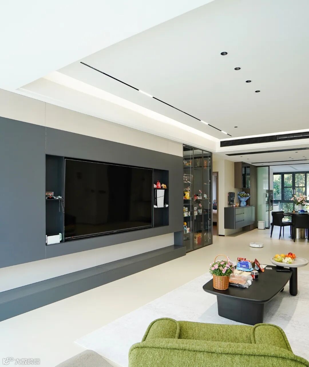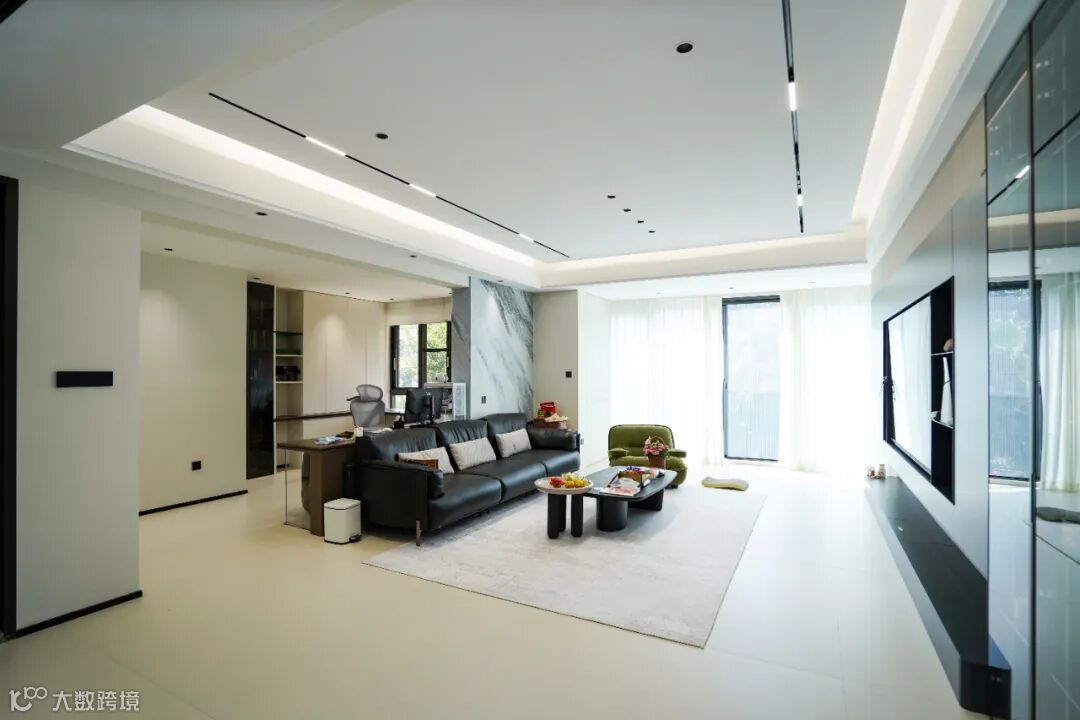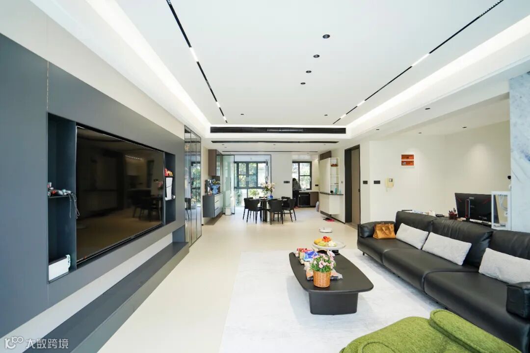 这套 155㎡的四居室,开放式的设计让客厅与餐厅、厨房流畅衔接,空间感瞬间拉满。浅色调的地面与墙面,搭配简约而有质感的家具,黑色的皮质沙发沉稳大气,绿色的单人椅则为空间注入一抹活力,整个空间明亮又通透。