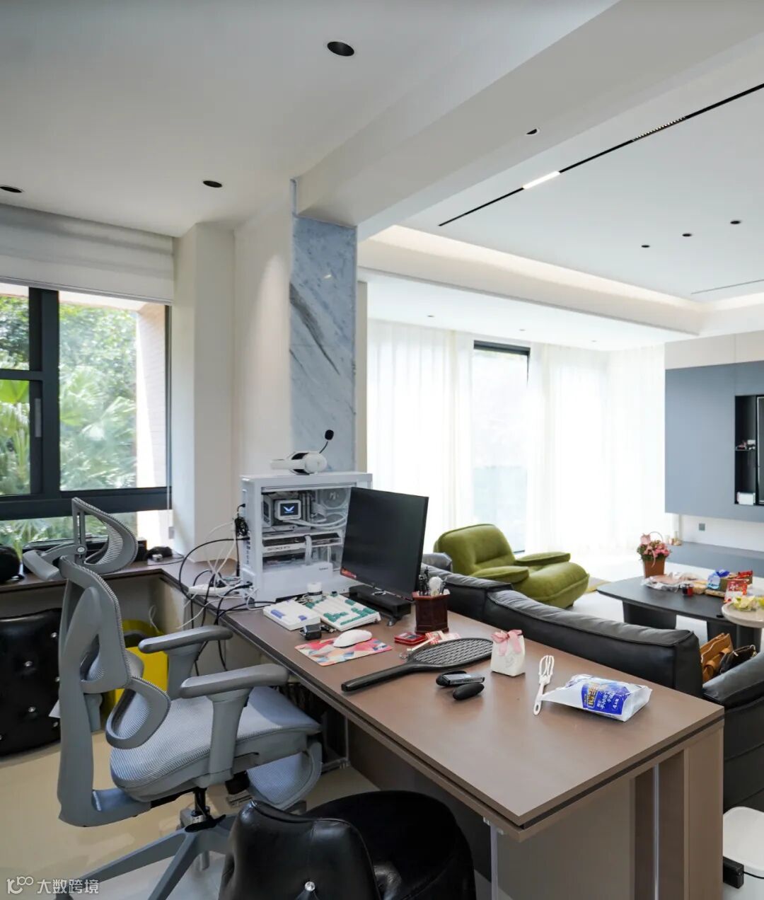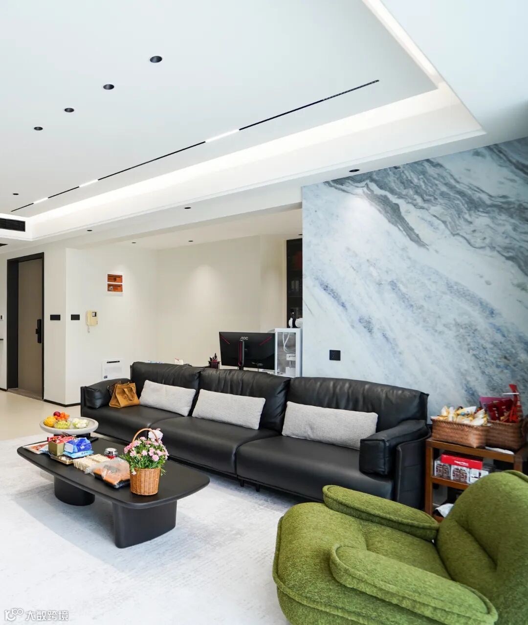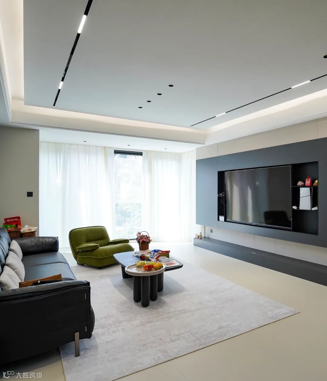 这套 155㎡的四居室,开放式的设计让客厅与餐厅、厨房流畅衔接,空间感瞬间拉满。浅色调的地面与墙面,搭配简约而有质感的家具,黑色的皮质沙发沉稳大气,绿色的单人椅则为空间注入一抹活力,整个空间明亮又通透。