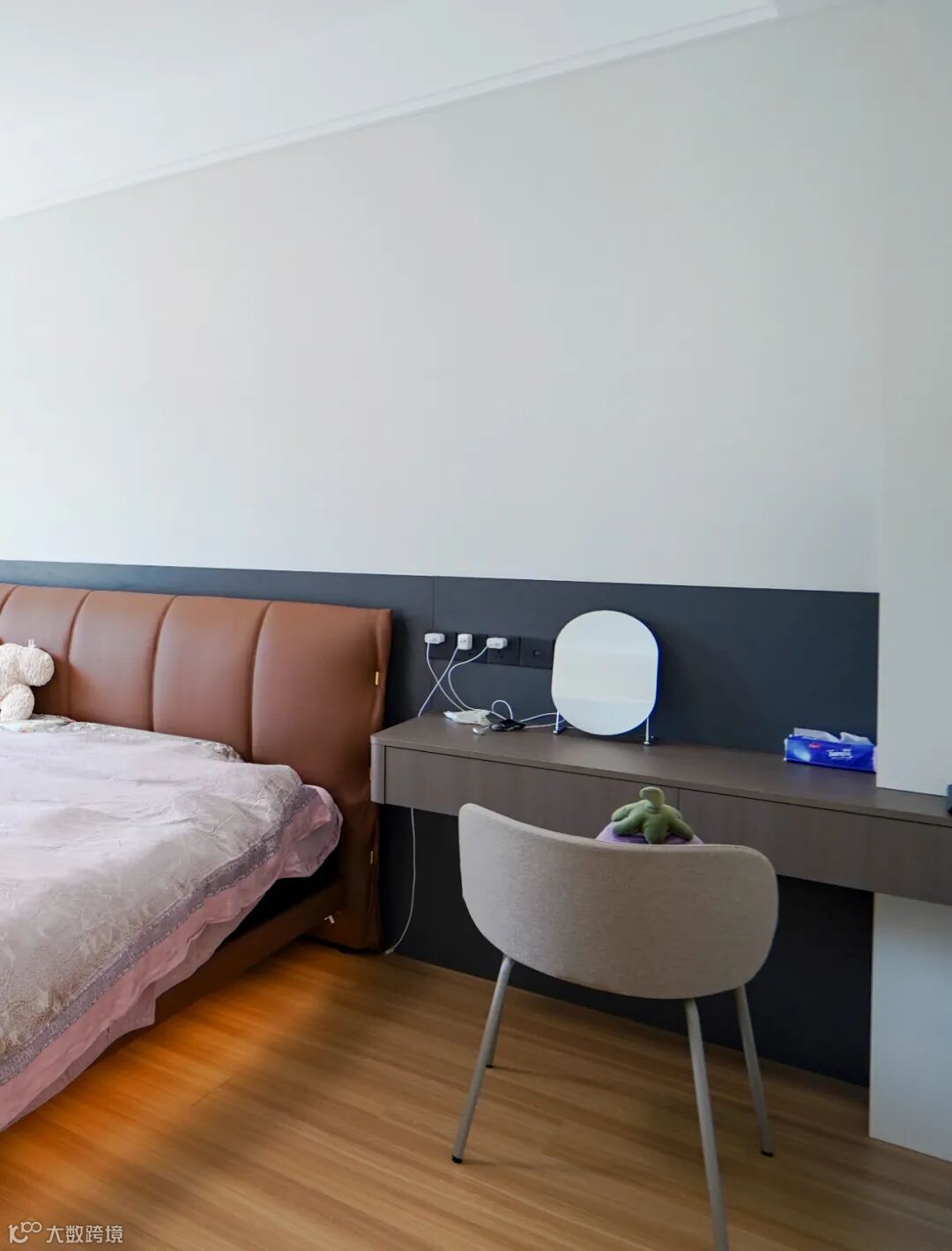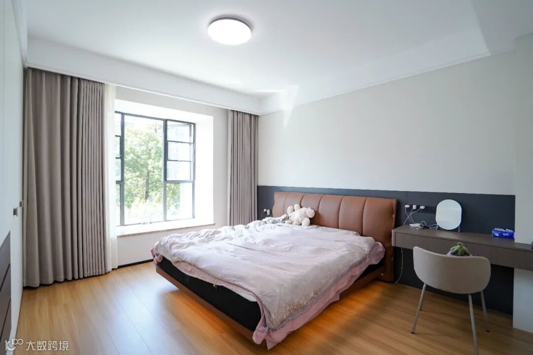 棕色与深灰拼接的墙面,搭配木质地板,暖呼呼的色调瞬间驱散困倦。一侧的书桌,是睡前阅读、偶尔处理点小工作的小天地。简洁的设计,搭配舒适的椅子,在这里待上一会儿,身心都能沉静下来。