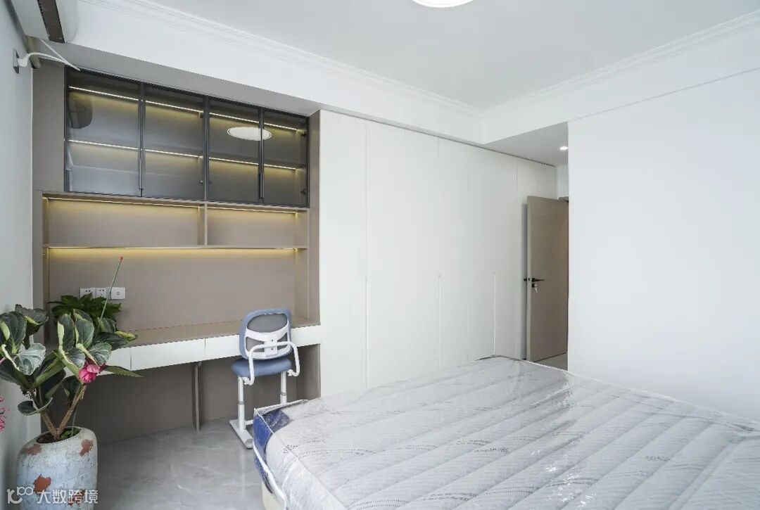 围绕“温馨、柔和、精致”的核心调性联动,开放格的“通透”,消解满墙衣柜的“厚重感”让主卧室既满足“大容量储物”的实用需求,又成为“私密、浪漫、有温度”的休憩场域。