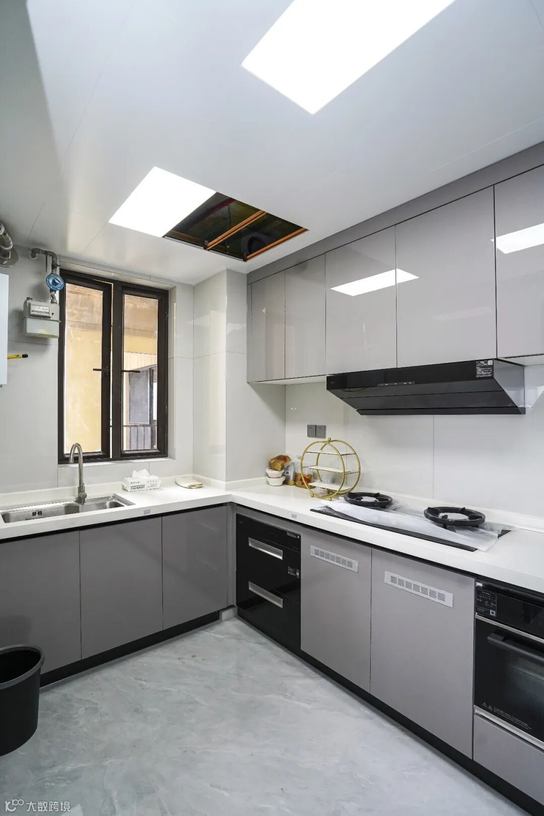 放弃了笨重的主灯,用顺着天花板延伸的线性灯 + 嵌入式筒灯做照明,天花板干净利落,光线柔和不刺眼,晚上开灯也不会有晃眼的直射光。