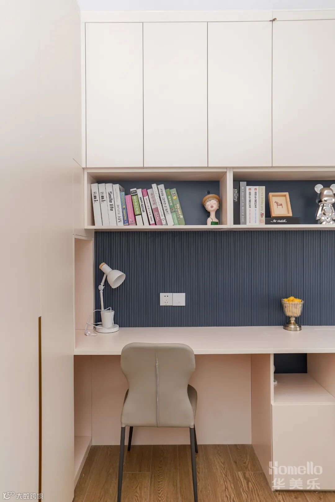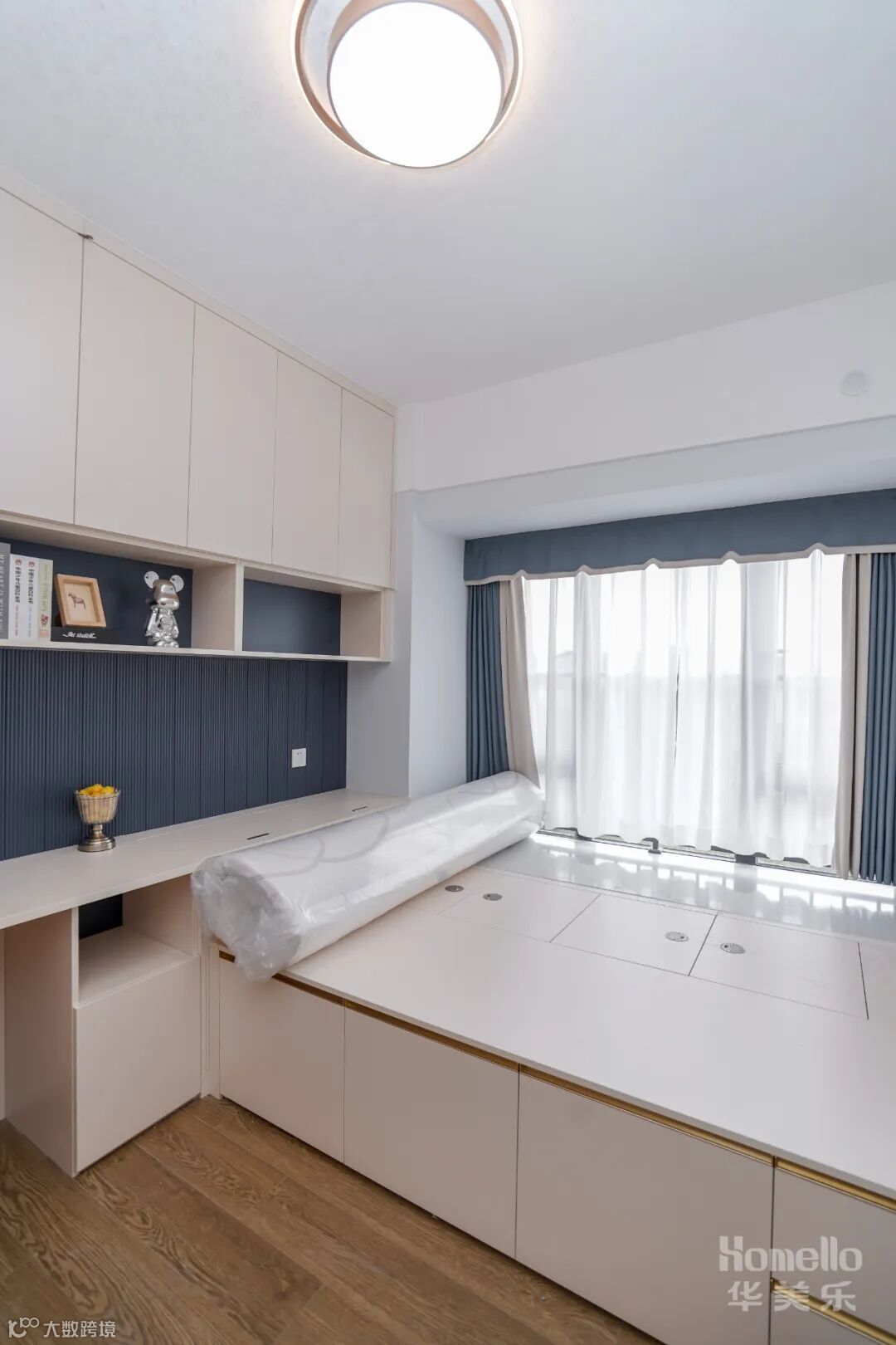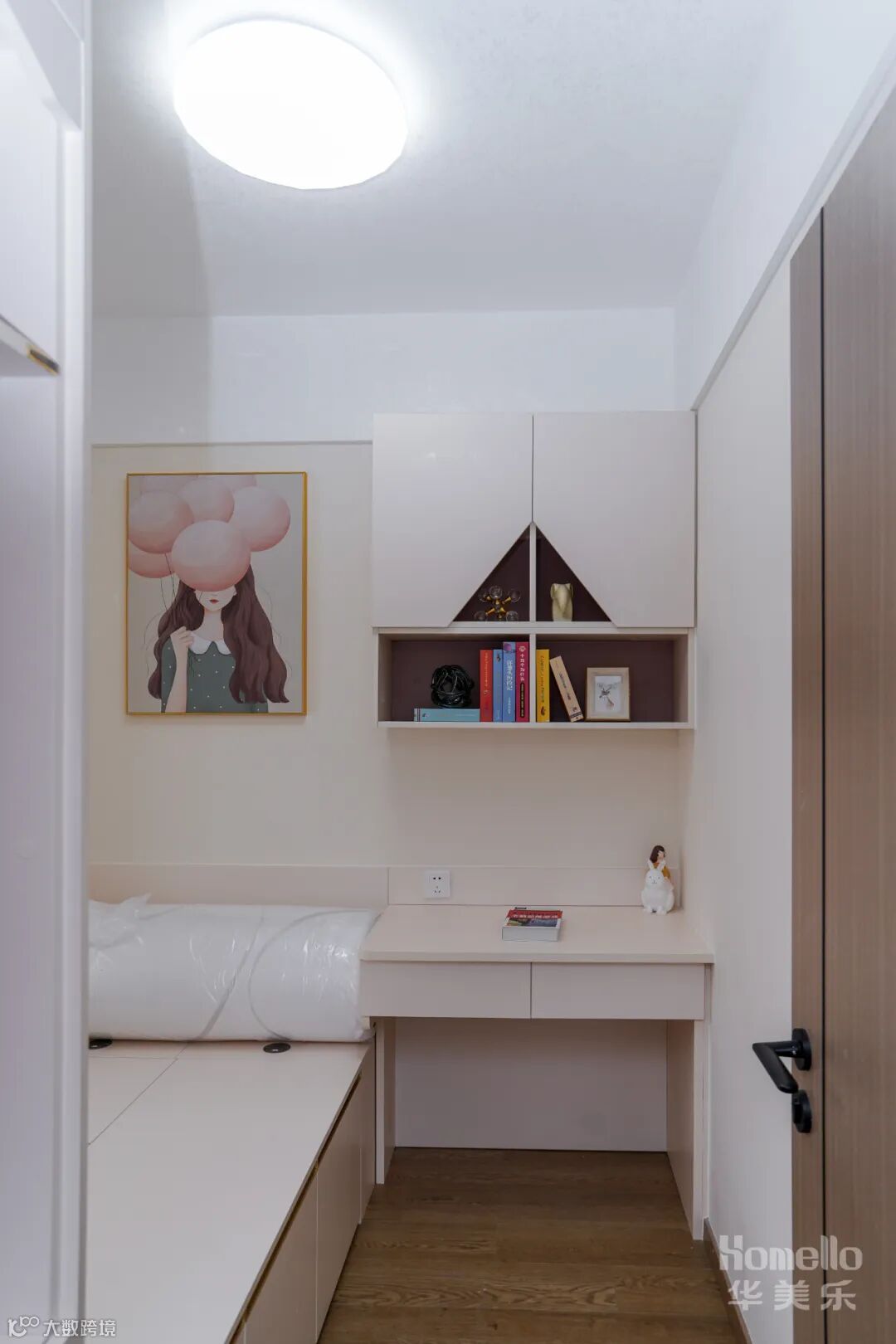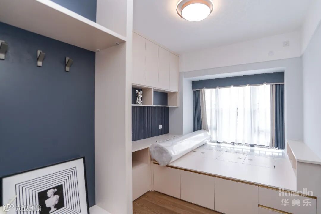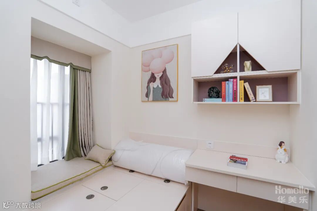 儿童房并不一味的填满童真符号,浅色系搭配少量拼接色块,把控童趣的尺度,让空间具备较长的成长范围。为了满足收纳以及儿童房后期需要,多功能储物空间,解决了后期收纳的烦恼。