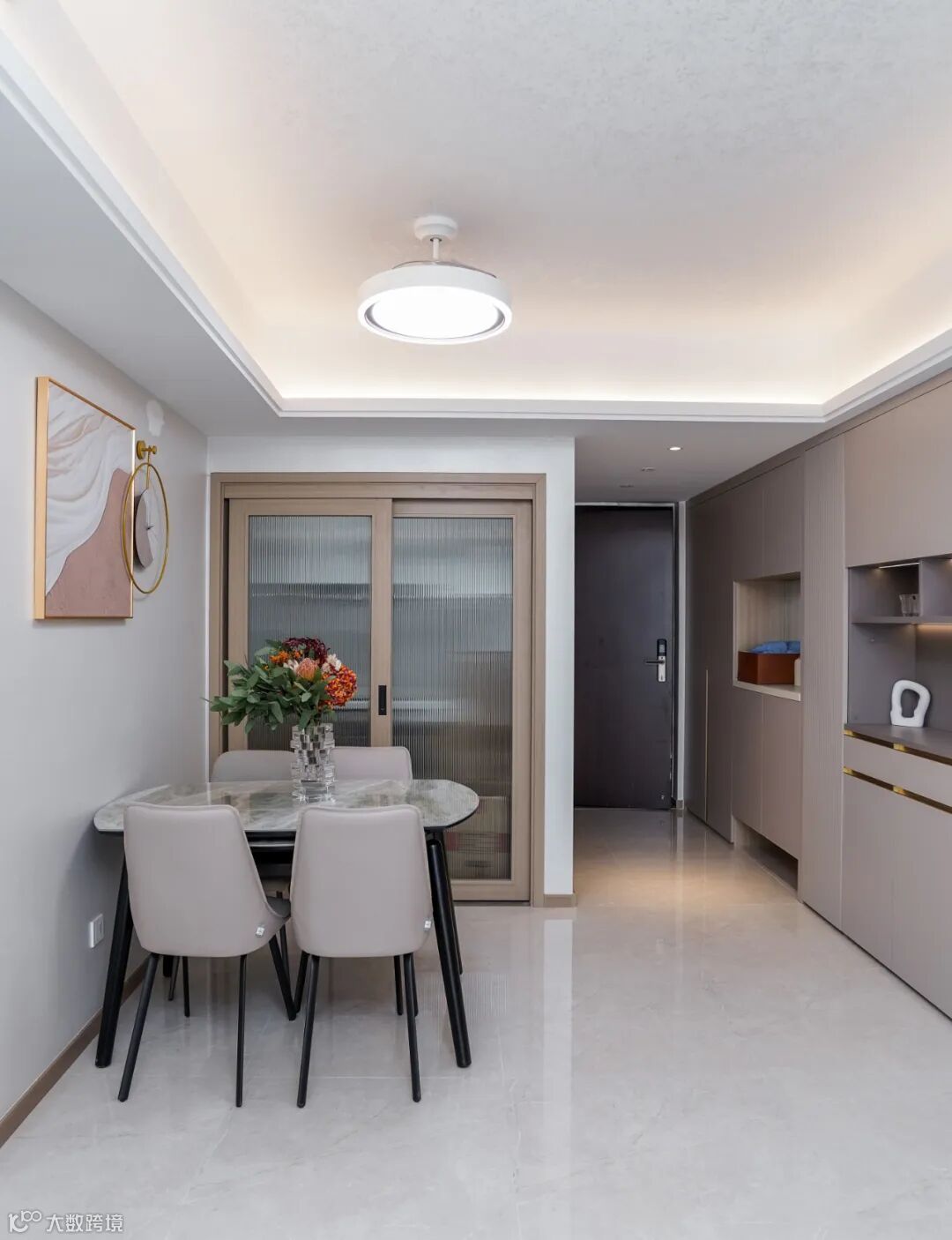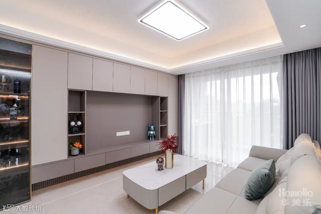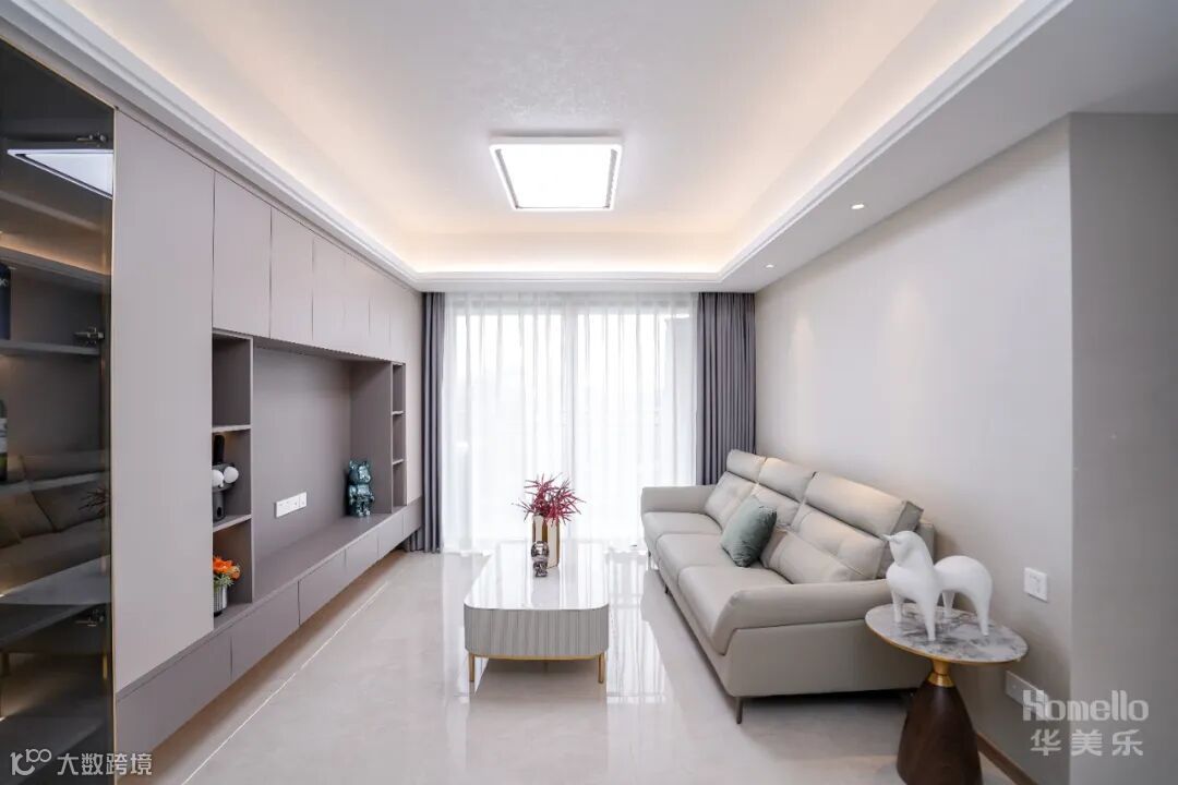 从入户门到阳台边这一整面墙做了鞋柜、餐边柜、电视背景墙连一体,软装也很简单,浅色系为主,没有精美的造型,简单却很温馨,空间也显大不少。