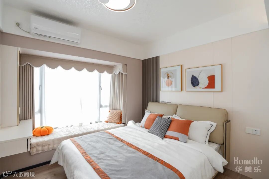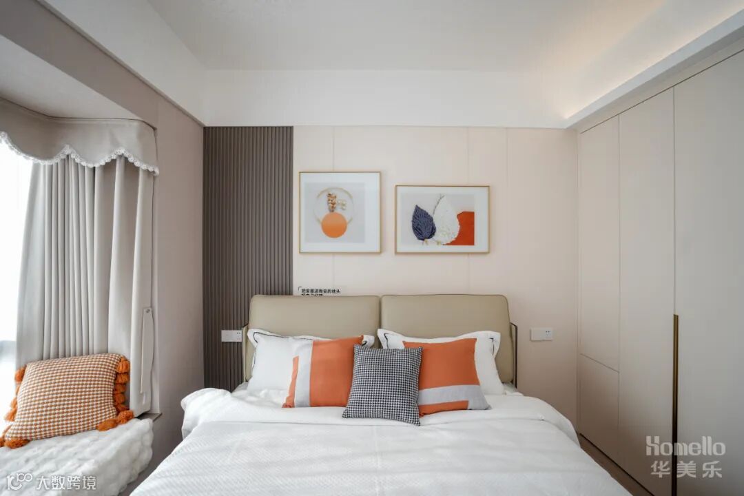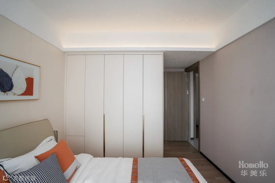 主卧以营造出温馨而宁静的睡眠氛围为主,选用米色、棕色和橙色。床头墙面选择木饰面,让整个房间感觉到温暖和舒适。
