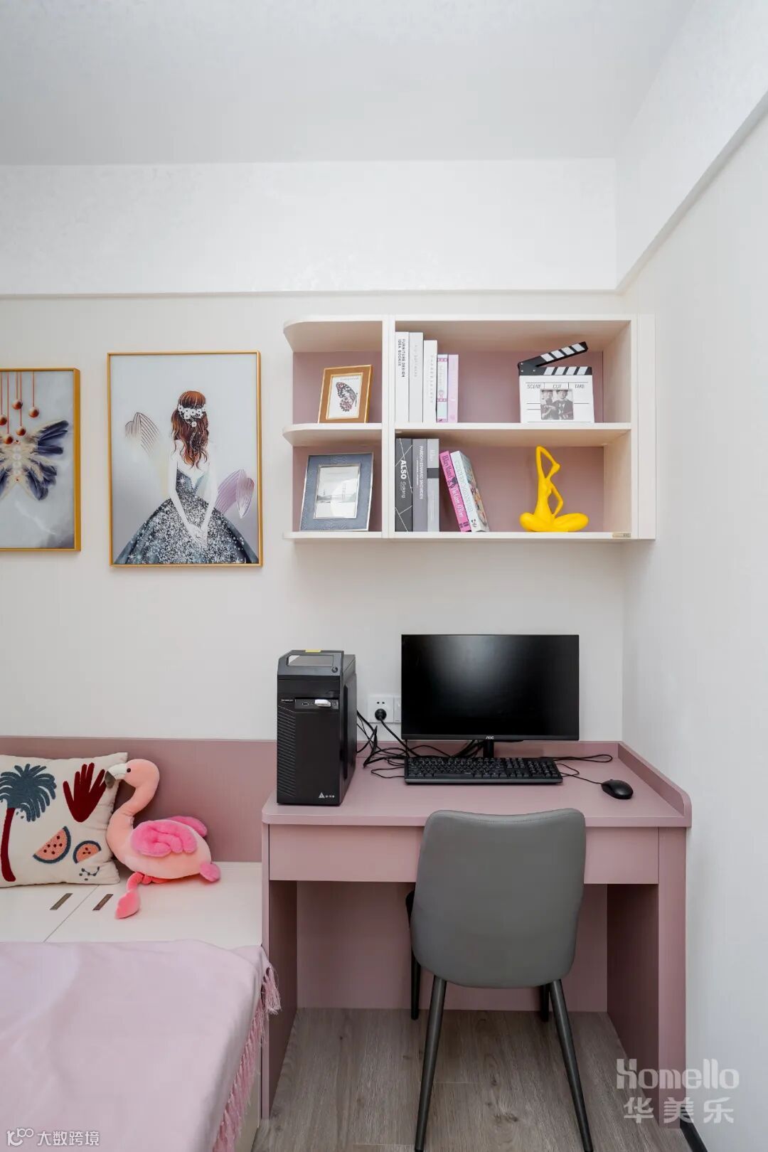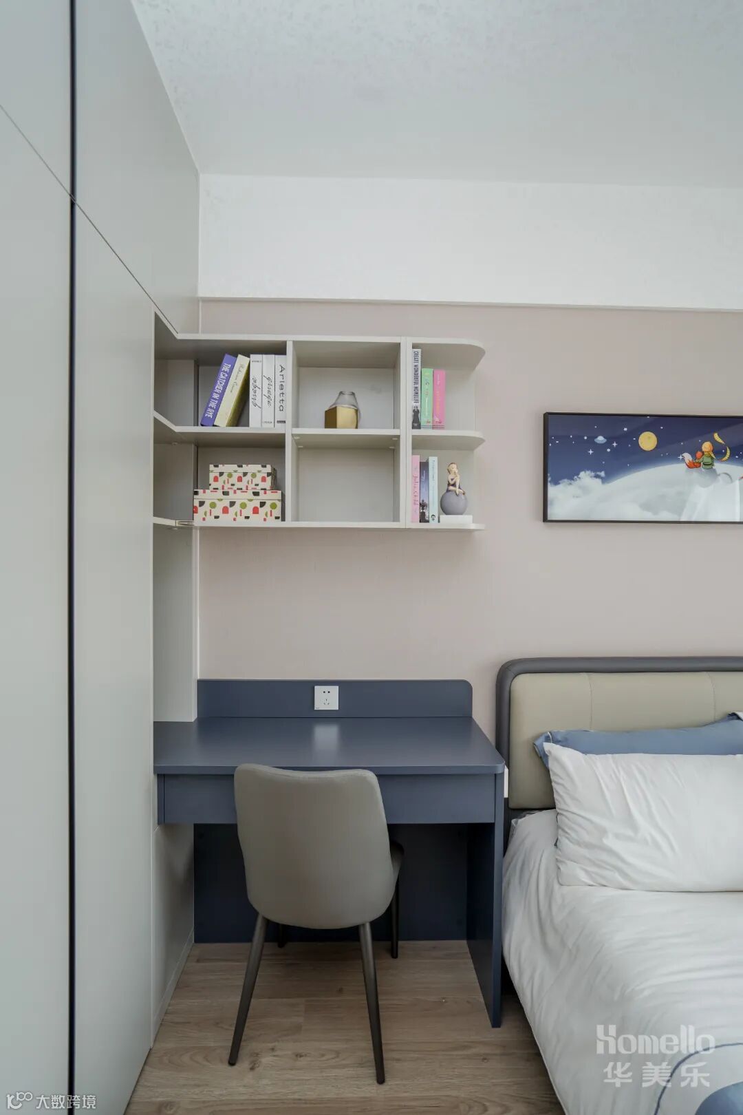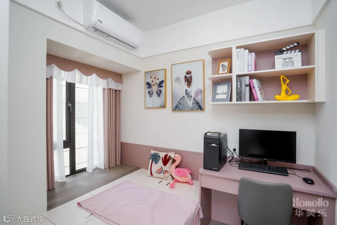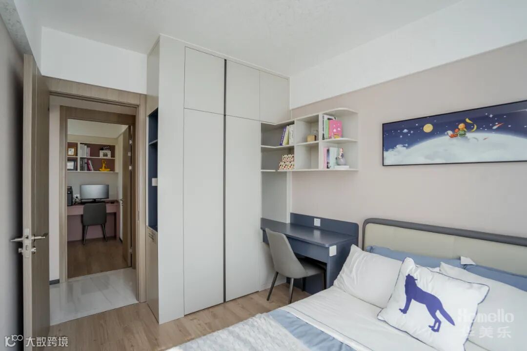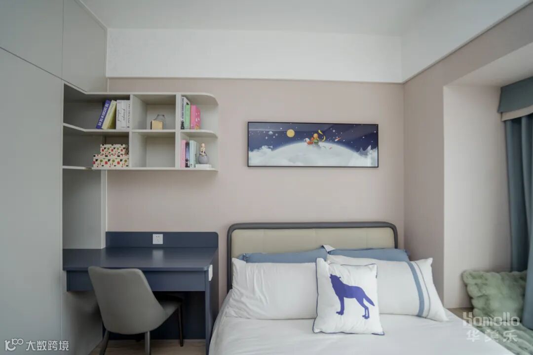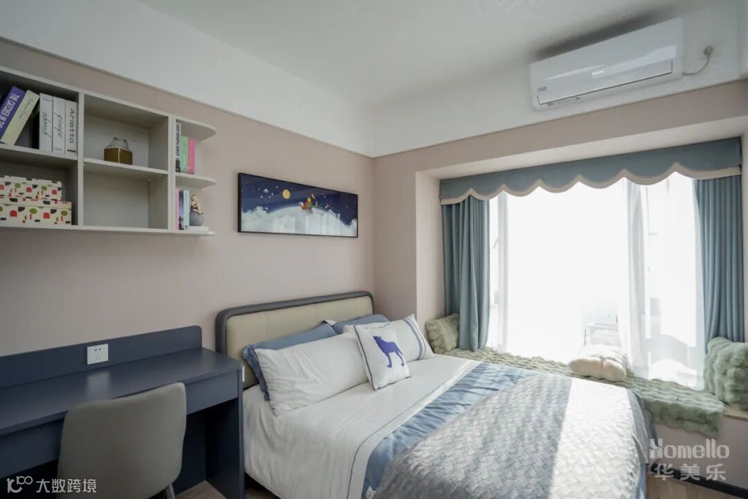 两件次卧都以功能性为主,开放书籍摆放格+书桌就是一个学习功能区,飘窗铺上柔软的垫子,就是一个舒适的阅读区,一个既适合休息又兼具学习功能的空间。