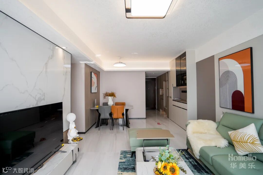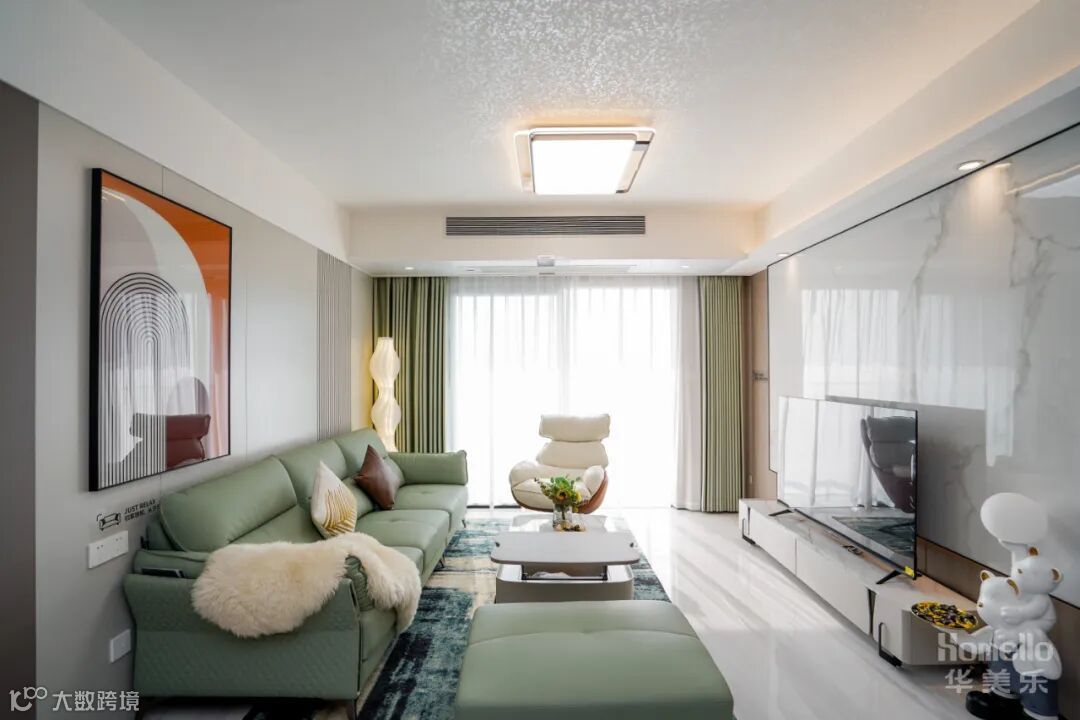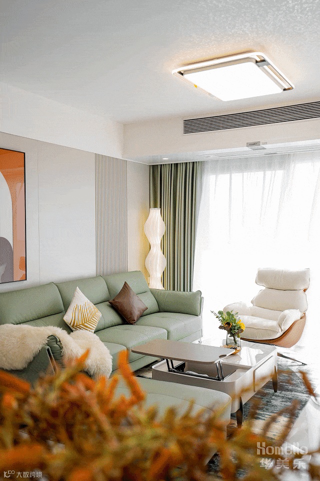 客厅注重舒适性、现代感,以浅绿色和白色为主,点缀橘红,营造出轻松、清新的氛围。大面积的落地窗使整个客餐厅空间有了通透感。