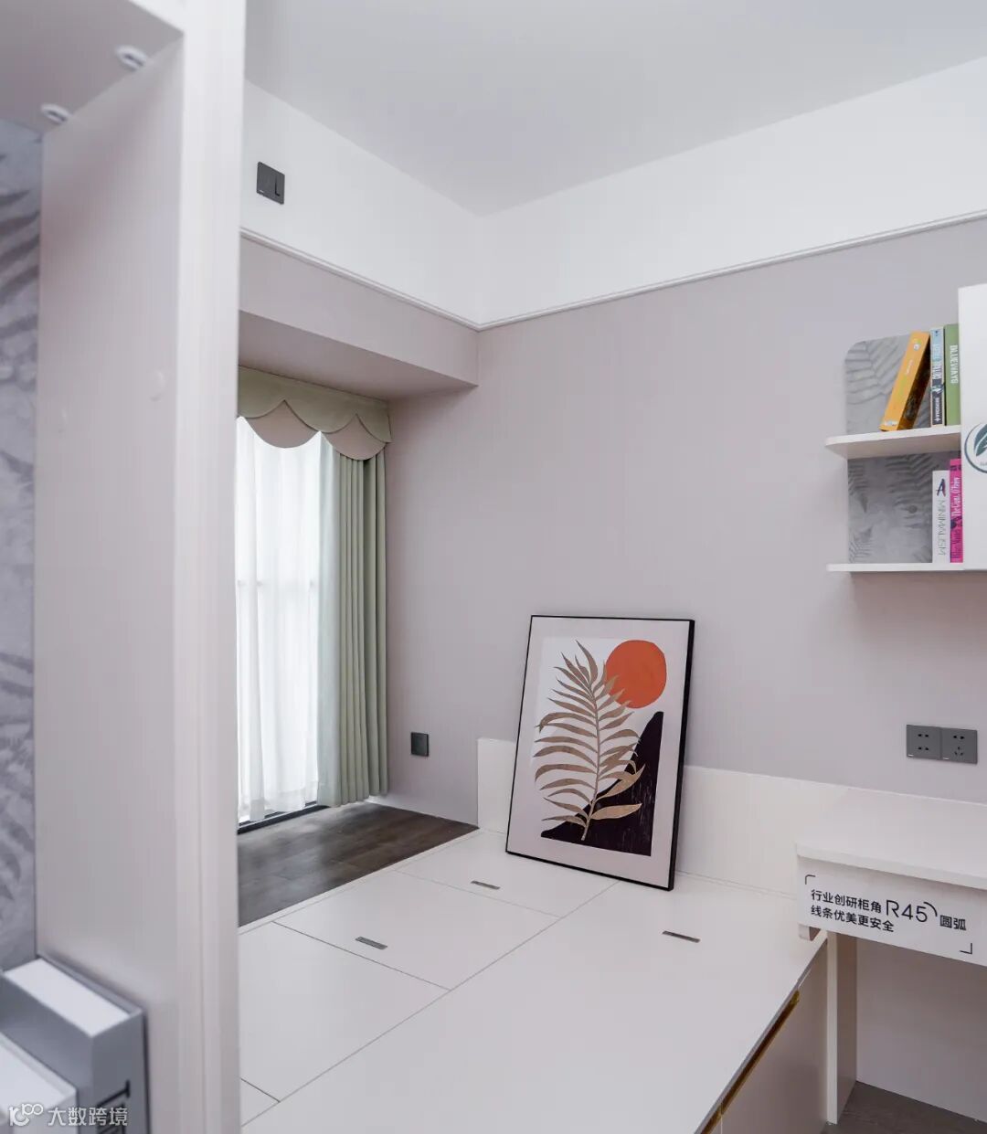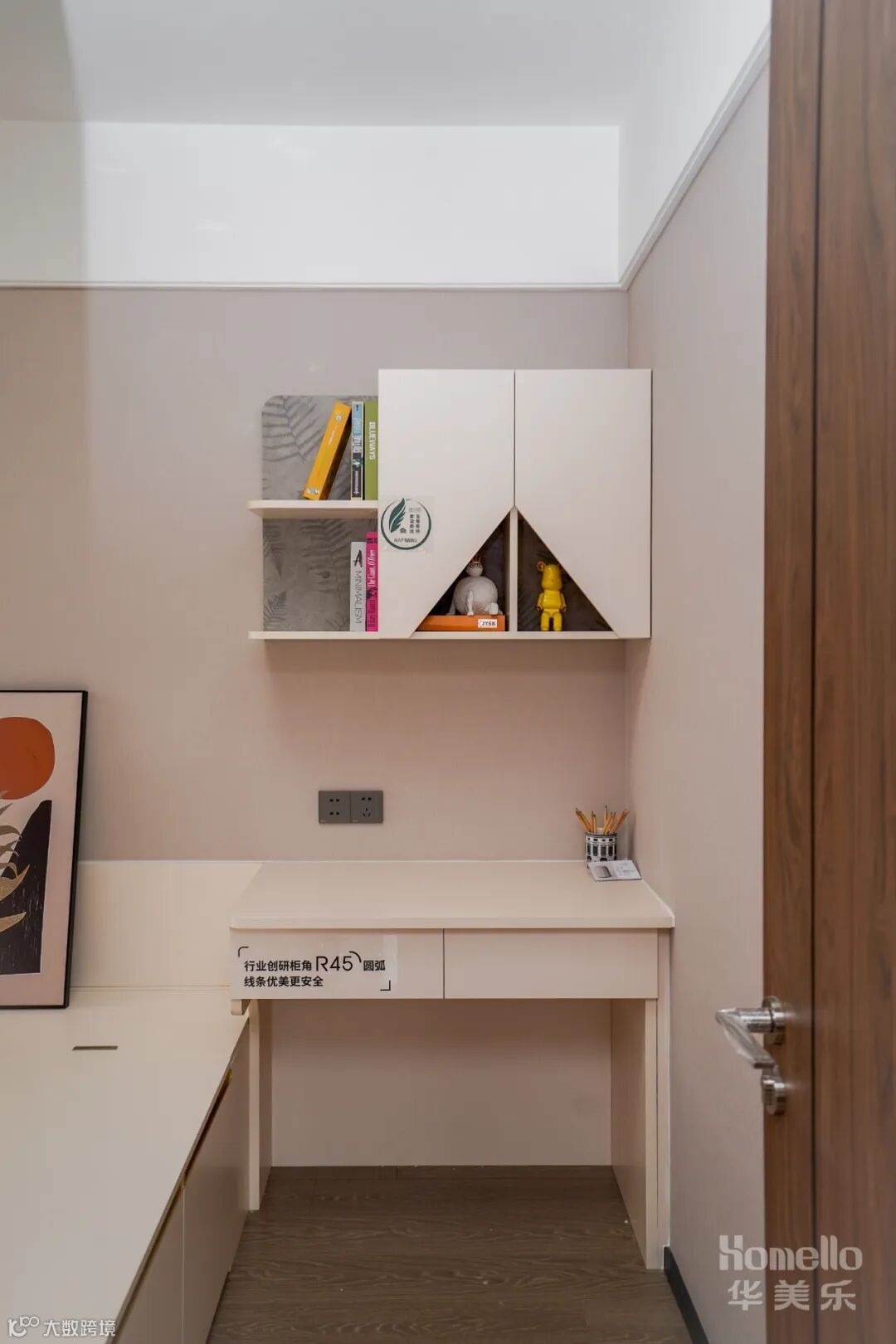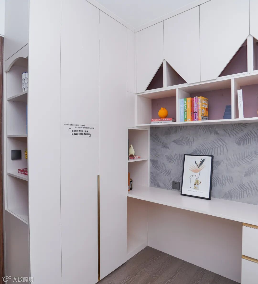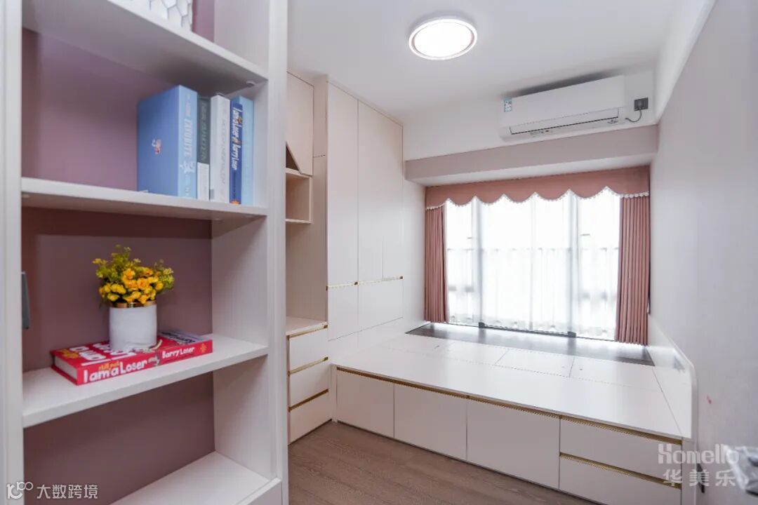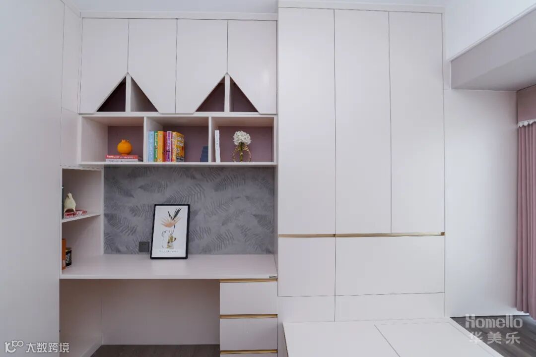 儿童房间的装修要注意安全问题,以简约、舒适、实用为主。衣柜与书桌并排设计,高低错落的展示柜放着玩具书籍与照片,显得温馨又舒适。