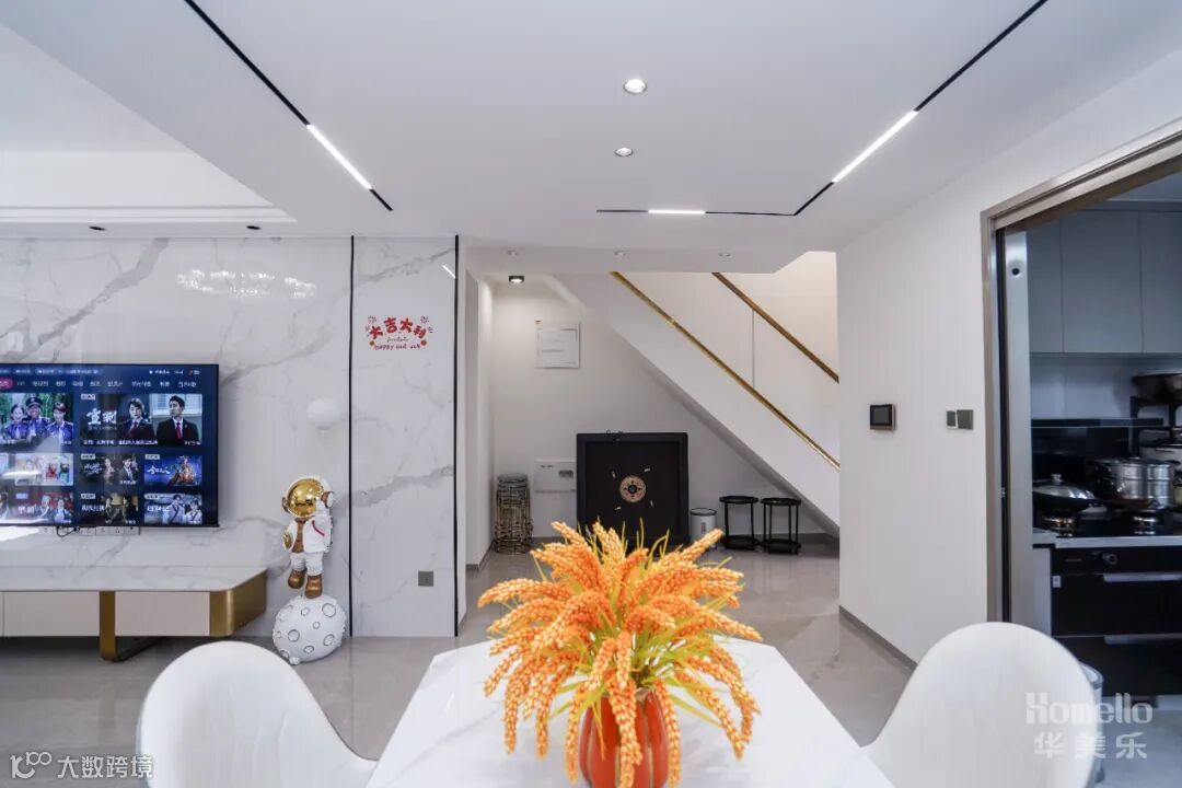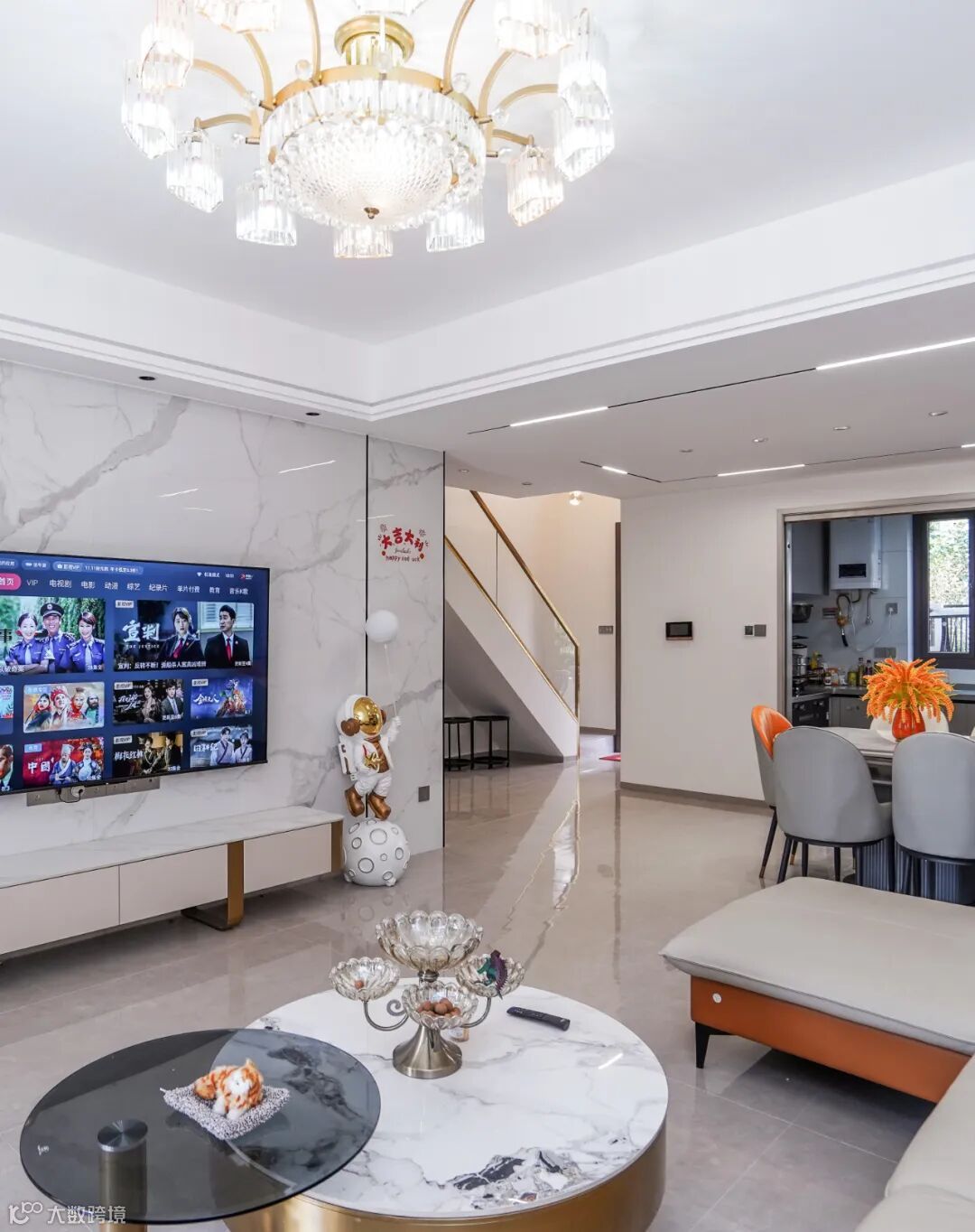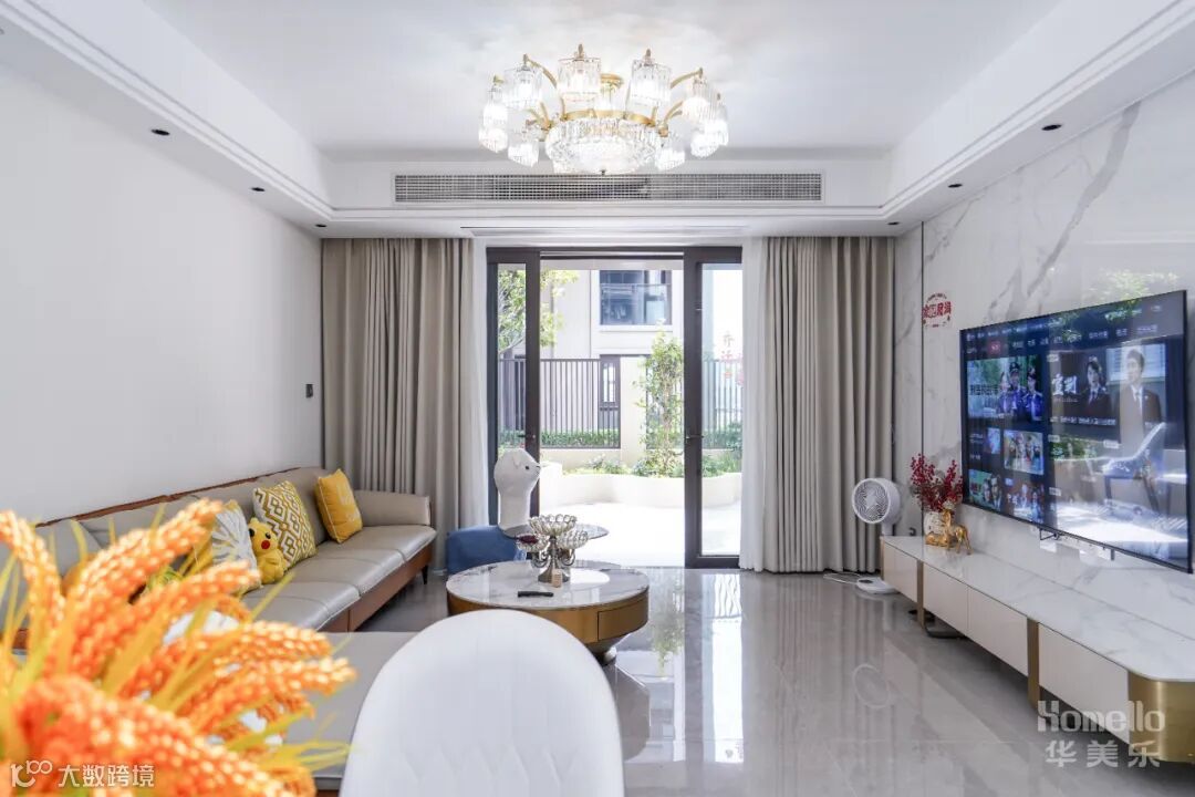 通刷大白墙、通铺大理石地板提高了室内明亮度, 双眼皮吊顶搭配水晶吊灯,简约的同时带出高级感。